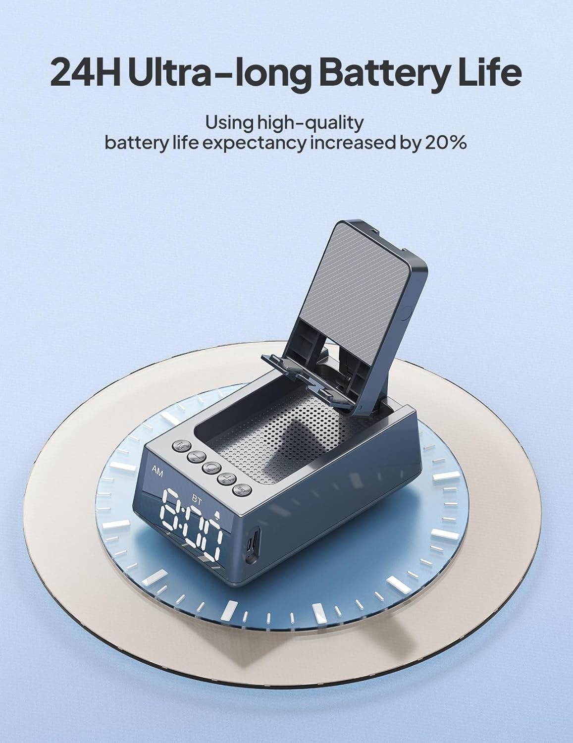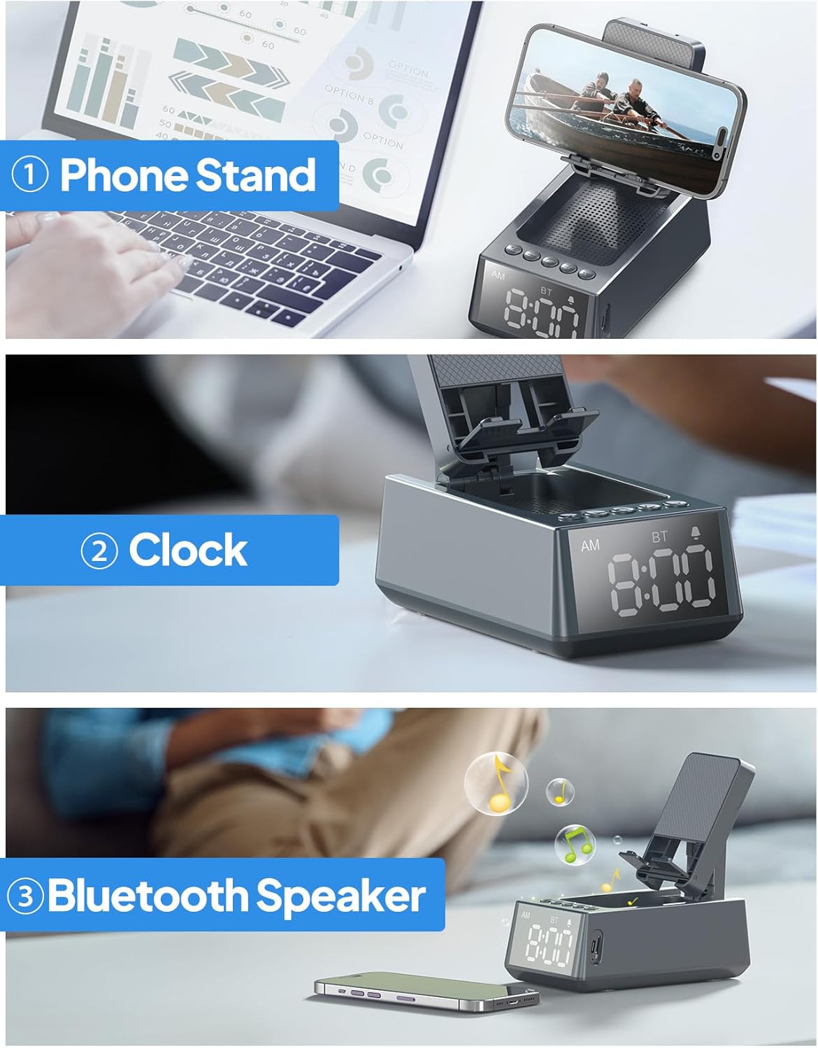 - 3-In-1 Design: A multifunctional, stylish, and cool gadget that combines a Bluetooth speaker, alarm clock, and phone stand in one. The adjustable stand is stable and meets the usage requirements for various viewing angles. It features stereo sound , with rich bass and clear treble, enhancing your audio experience when used with a phone, suitable for binge-watching, gaming, making video calls without hands to hold phone, or online meetings. This is the perfect gift for oneself and others.