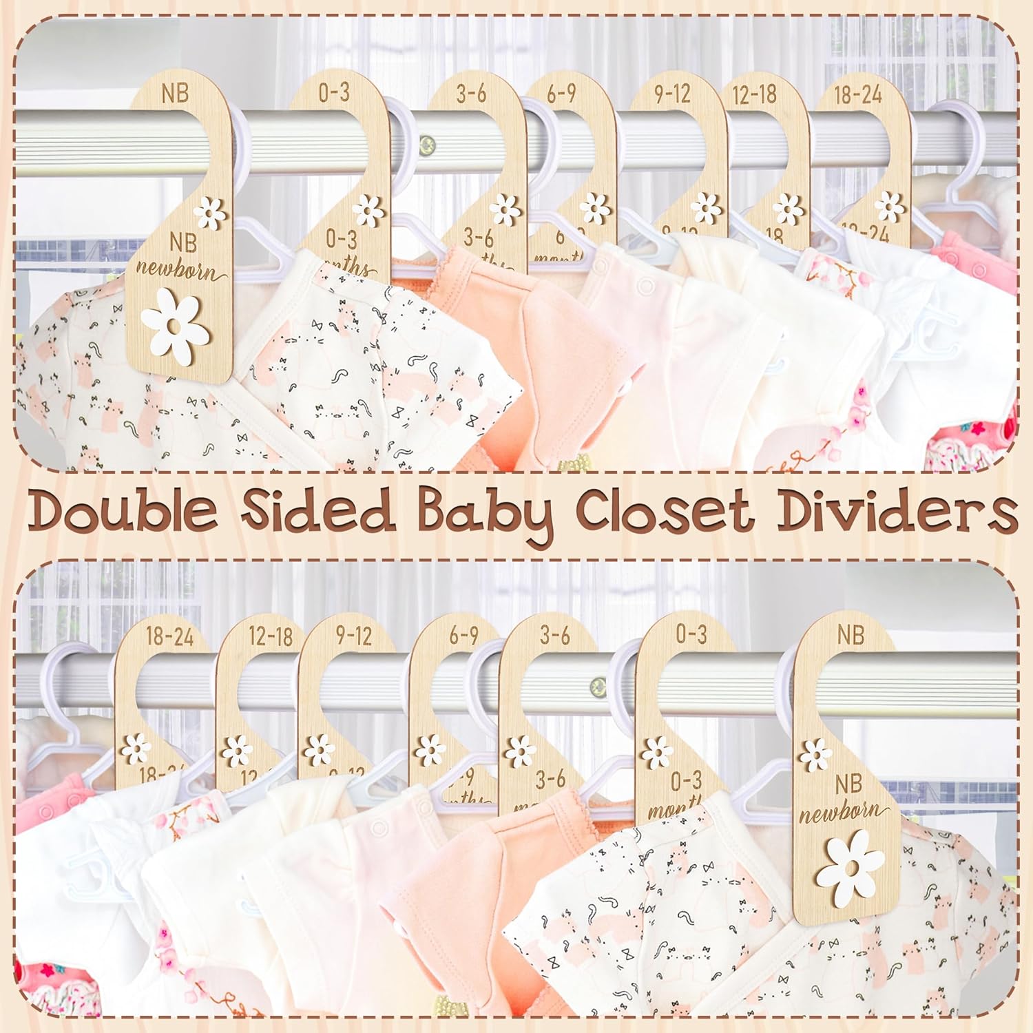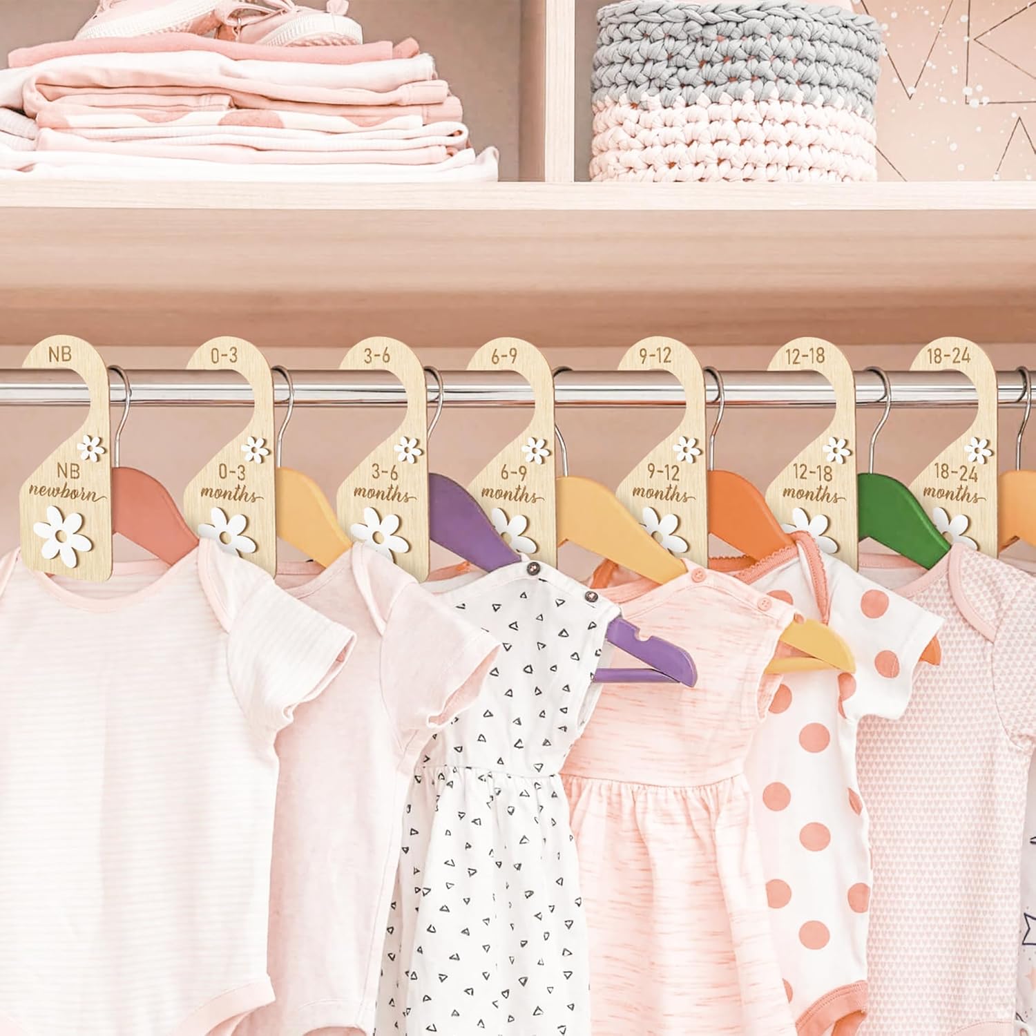 R HORSE Wooden Baby Closet Dividers - 8Pcs Double-Sided 3D Daisy Nursery Closet Organizer Baby Clothes Size Hanger Dividers Newborn Nursery Decor Birthday Gift for Boy Girl (0-24 Months)