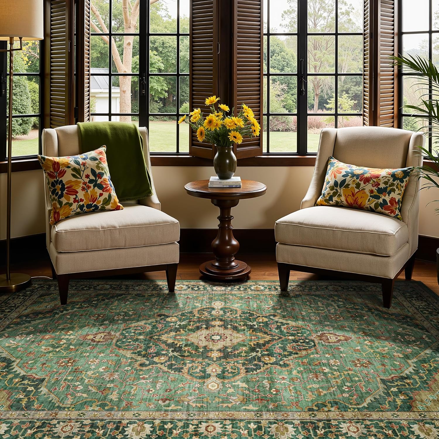 6x9 Vintage Rugs for Dining Room, Washable Rugs Non Slip Large Area Rug for Living Room Bedroom Office, Floor Decoration Big Rug Mat Low-Pile Kid & Pet Friendly(Border Green)