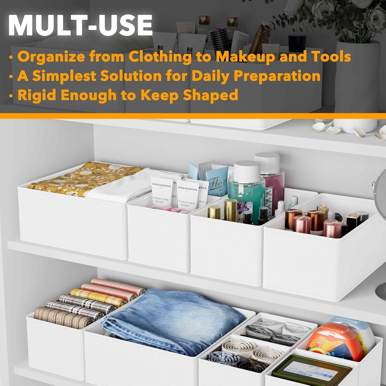 - Mult-size: 3 size bins can be make smaller or larger storage parts to stay organized and save space; Sort clothing, baby clothes, bra, socks, underwears, scarves, tools, cutlery, medicine, vitamins, jewelry, makeup and much more.