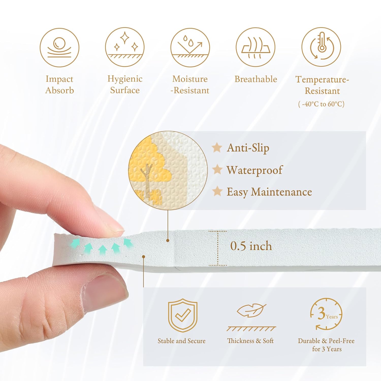 - 【Extra Thick and Easy to Wipe】Up to 0.5 inches thick! Our mats are 100% waterproof, easy to clean and durable! Just wipe off the mess with a damp cloth and mild detergent, and they will be like new. With no extra trim pieces, our interlocking foam holds together extremely tightly and won't get ripped by those curious little fingers - which means less mess and choking hazards - ever! Our mat assembles easily in minutes and is the perfect play mat for babies.