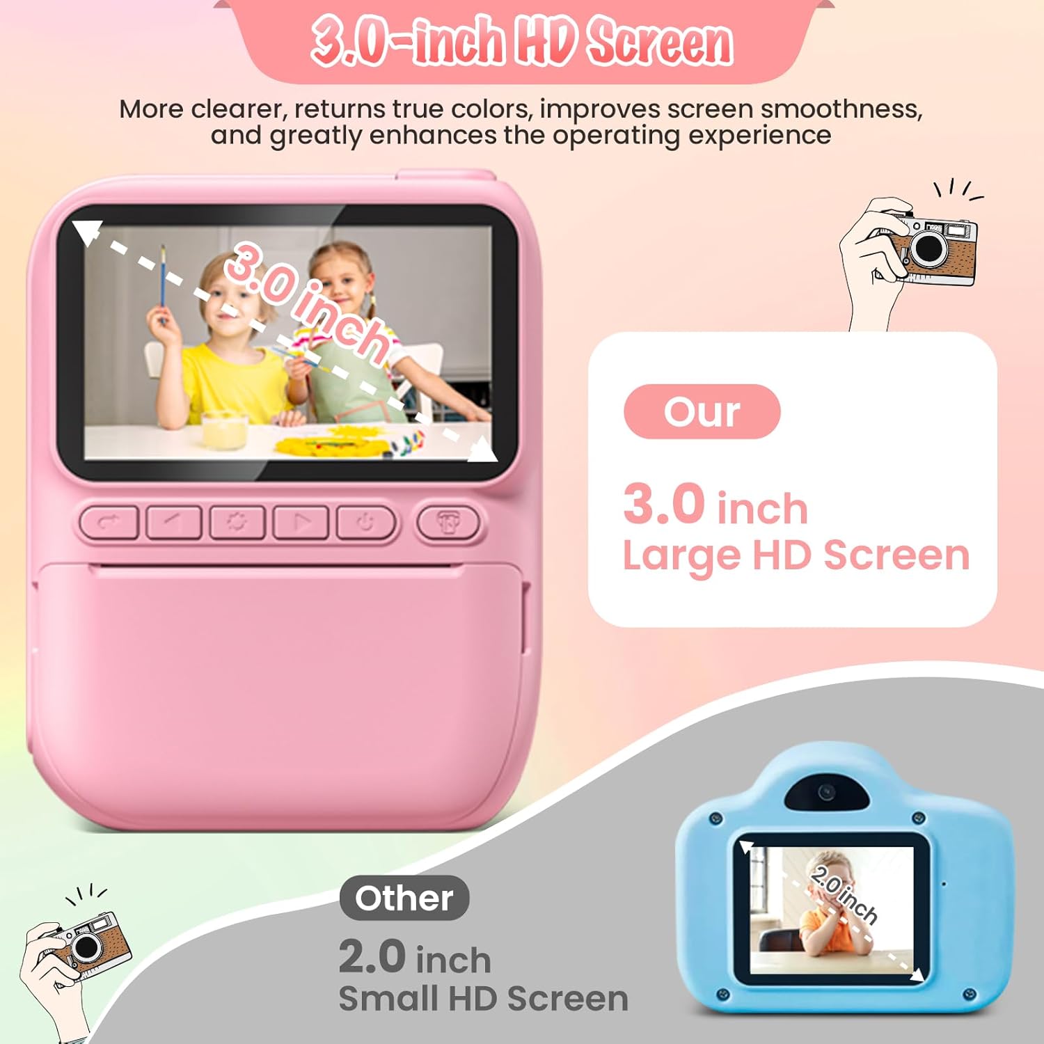 - 【Protecting Kids Eyesight】Newly upgraded larger and clearer IPS screen up to 3.0 inches. Restore true colors, improve the smoothness to use the screen. Protect your kids eyesight and greatly improve the operating experience at the same time .
