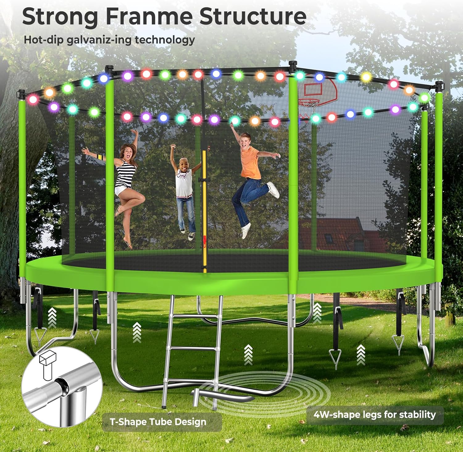 - 【Super Bouncy 12FT Trampoline with Lights】Reinforced jumping mat with heavy-duty stitching technology for superior bounce and durability; supports greater weight capacity. Past American UV standard 5000 hours test for longer service life