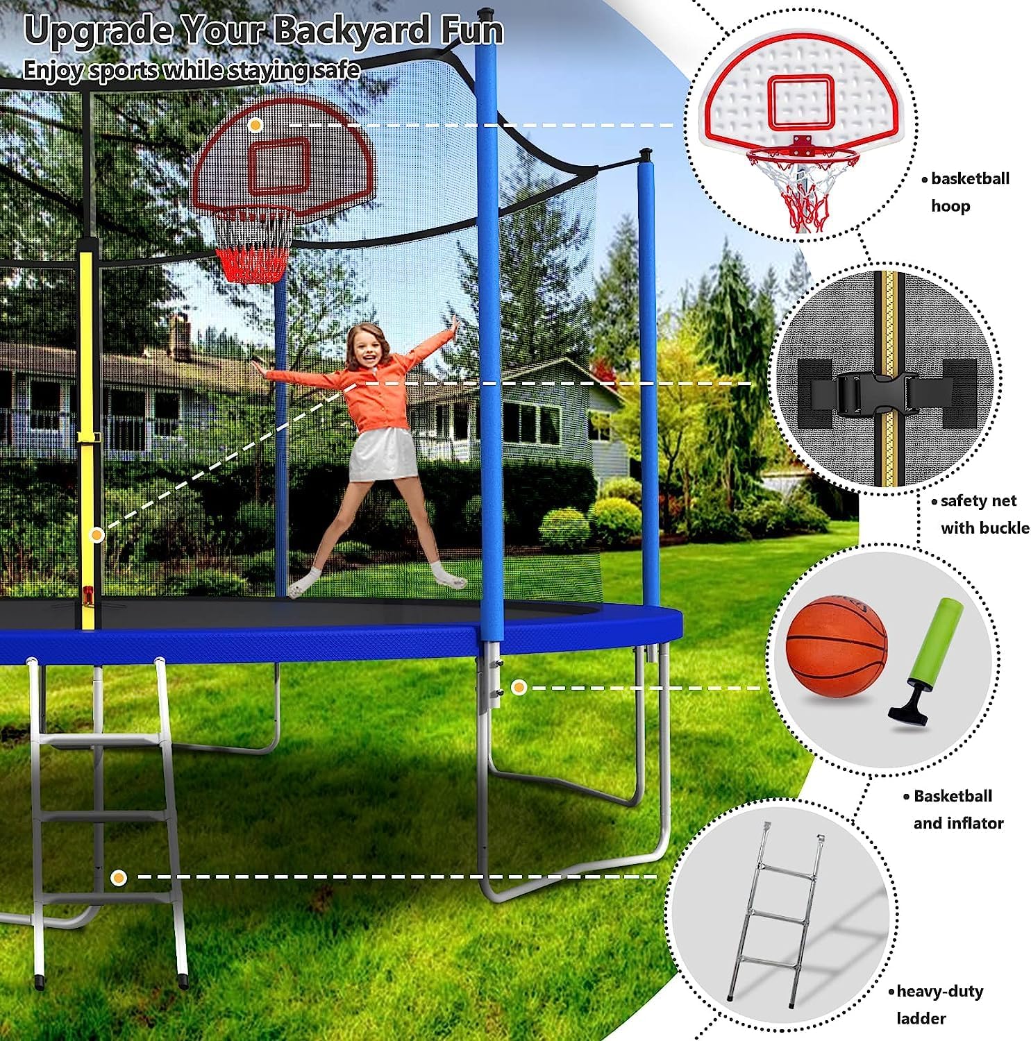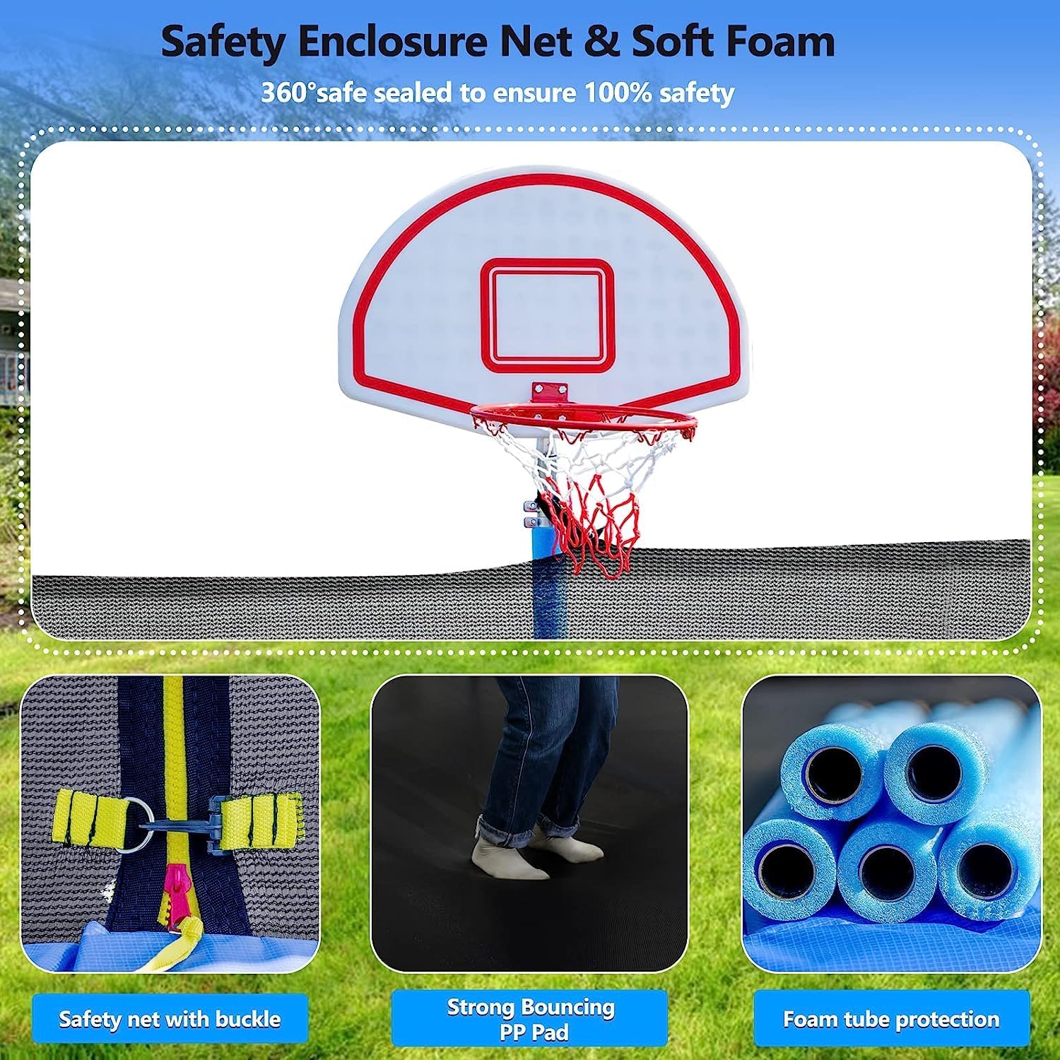 - 【Easier to Access】Our 14ft trampoline with basketball hoop design increases the length of the zipper, making it easier for users to enter and exit. Tangle resistant zipper keeps your child safe and your mind at ease