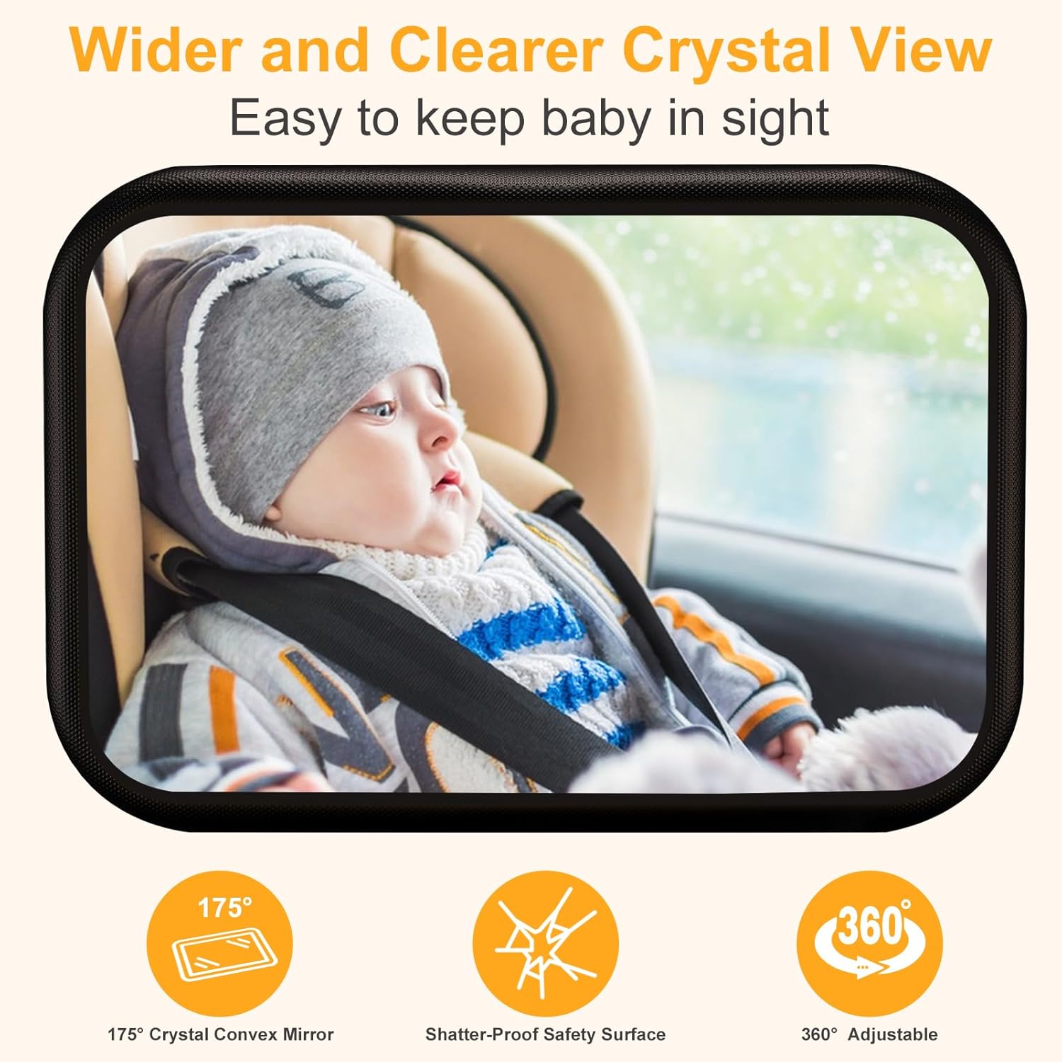 - WIDE ANGLE CONVEX MIRROR - This car seat mirrors for baby rear facing provides an extra - large wide angle that gives you a panoramic view, convenient to keep an eye on your baby's safety whenever you drive,and this baby mirror for car back seat full view infant is very shock-proof and can clearly see your baby.