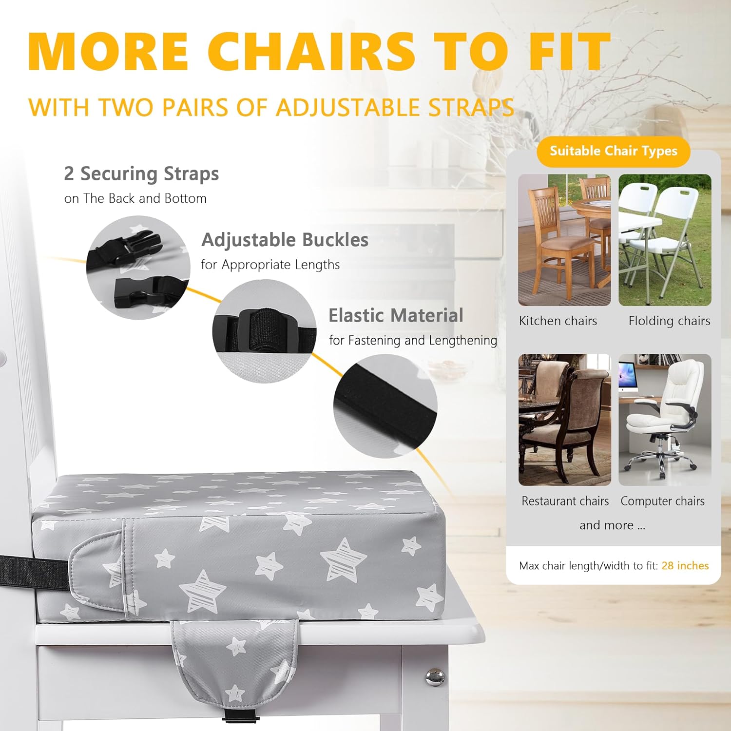 - 【Adjustable & More Chairs To Fit】The Booster Seat for Kitchen Chair comes with two pairs of adjustable straps, which can fit a wide range of chair sizes. Whether your chair is small, medium, or large, this seat can be adjusted to fit perfectly. It offers flexibility and convenience, allowing your baby to use it comfortably on any chair in your home.