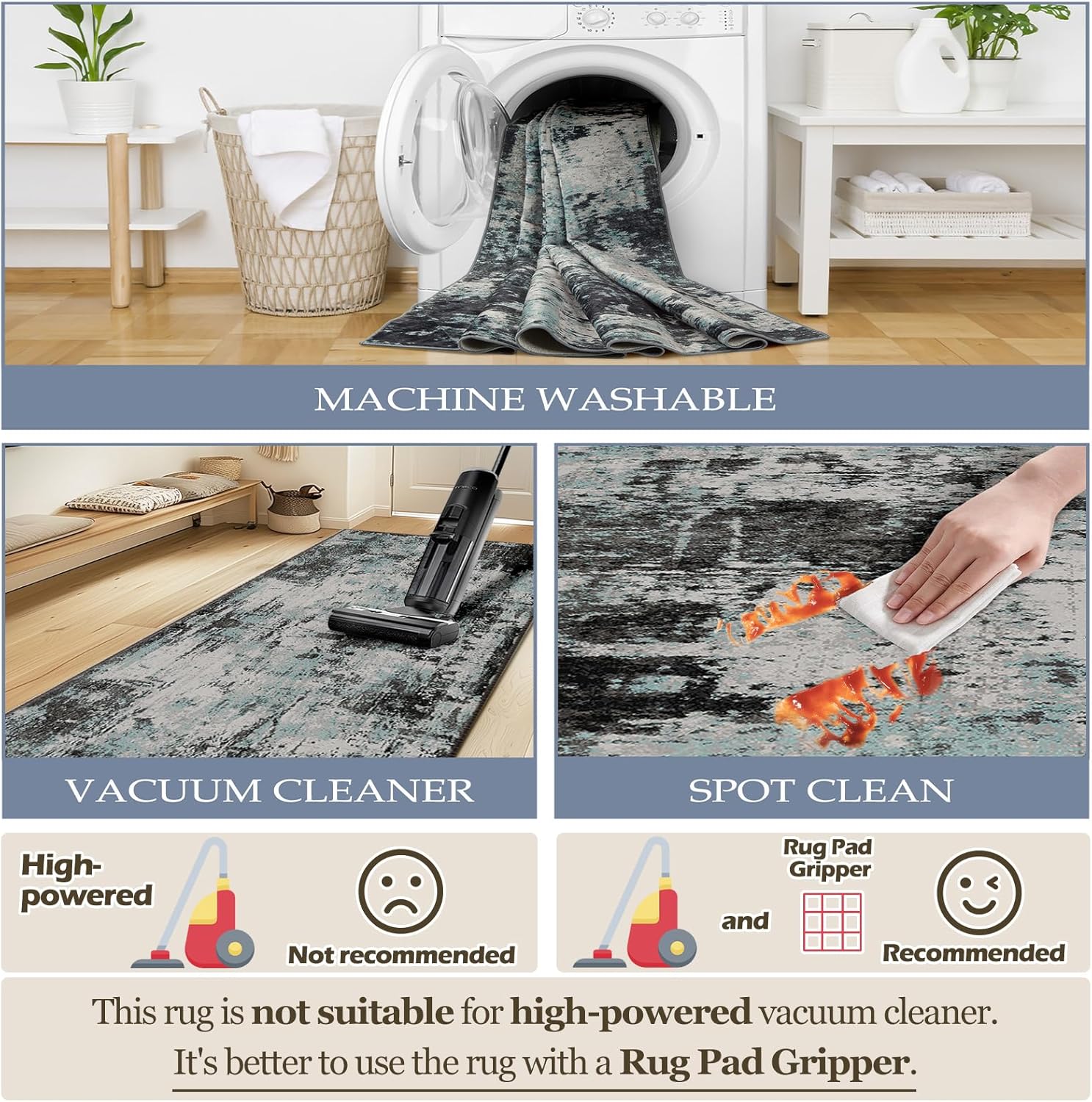 - Tides Series β Effortless style that flows with your life.This modern machine-washable non-slip rug features reinforced edges and a low-pile design that resists dirt. Its water-repellent surface makes spills easy to clean - liquids bead up for quick wiping. Simply machine wash in cold water (no bleach) to refresh. The non-slip backing keeps it securely in place. A perfect blend of function and contemporary design for active homes.