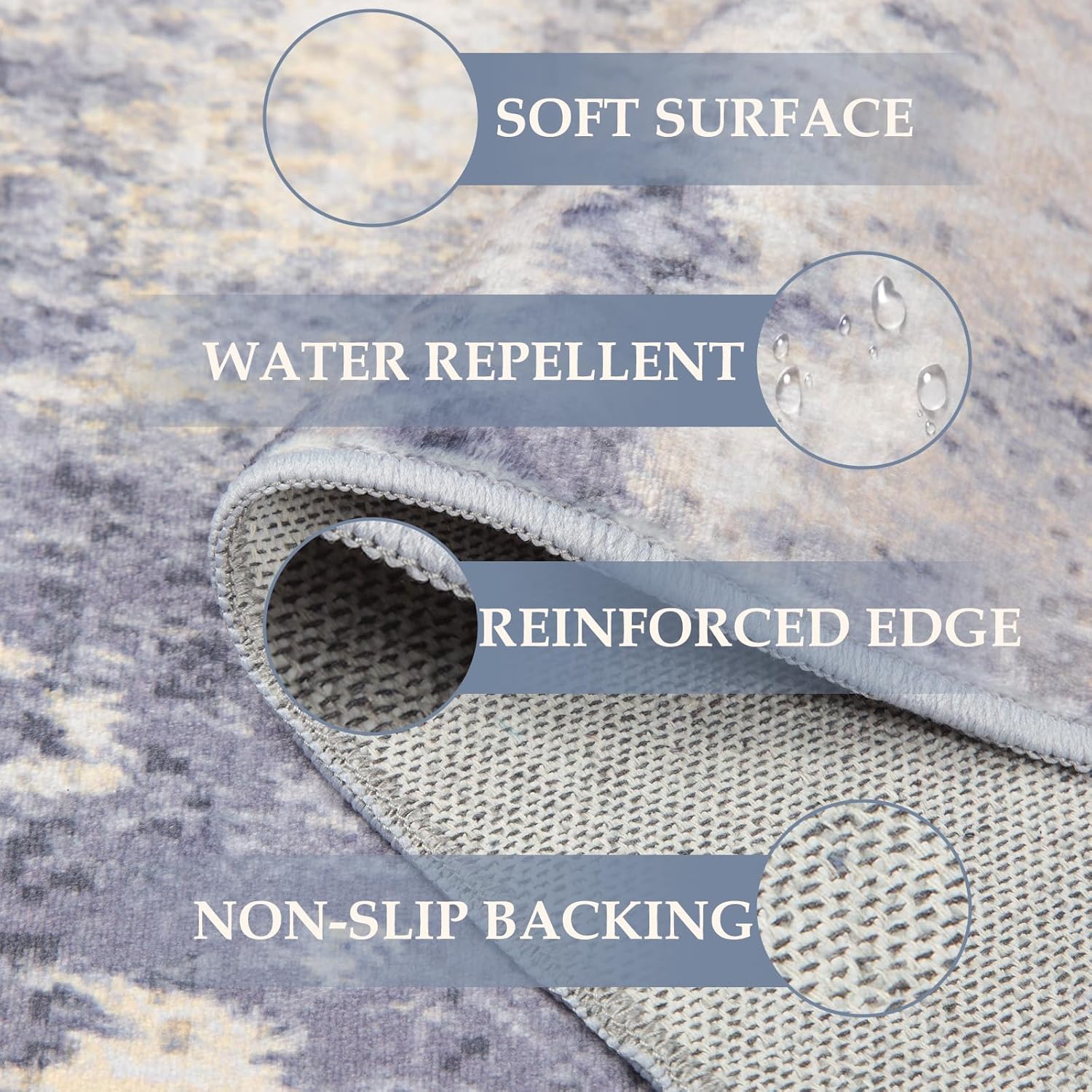 - Tides Series β Effortless style that flows with your life.This modern machine-washable non-slip rug features reinforced edges and a low-pile design that resists dirt. Its water-repellent surface makes spills easy to clean - liquids bead up for quick wiping. Simply machine wash in cold water (no bleach) to refresh. The non-slip backing keeps it securely in place. A perfect blend of function and contemporary design for active homes.