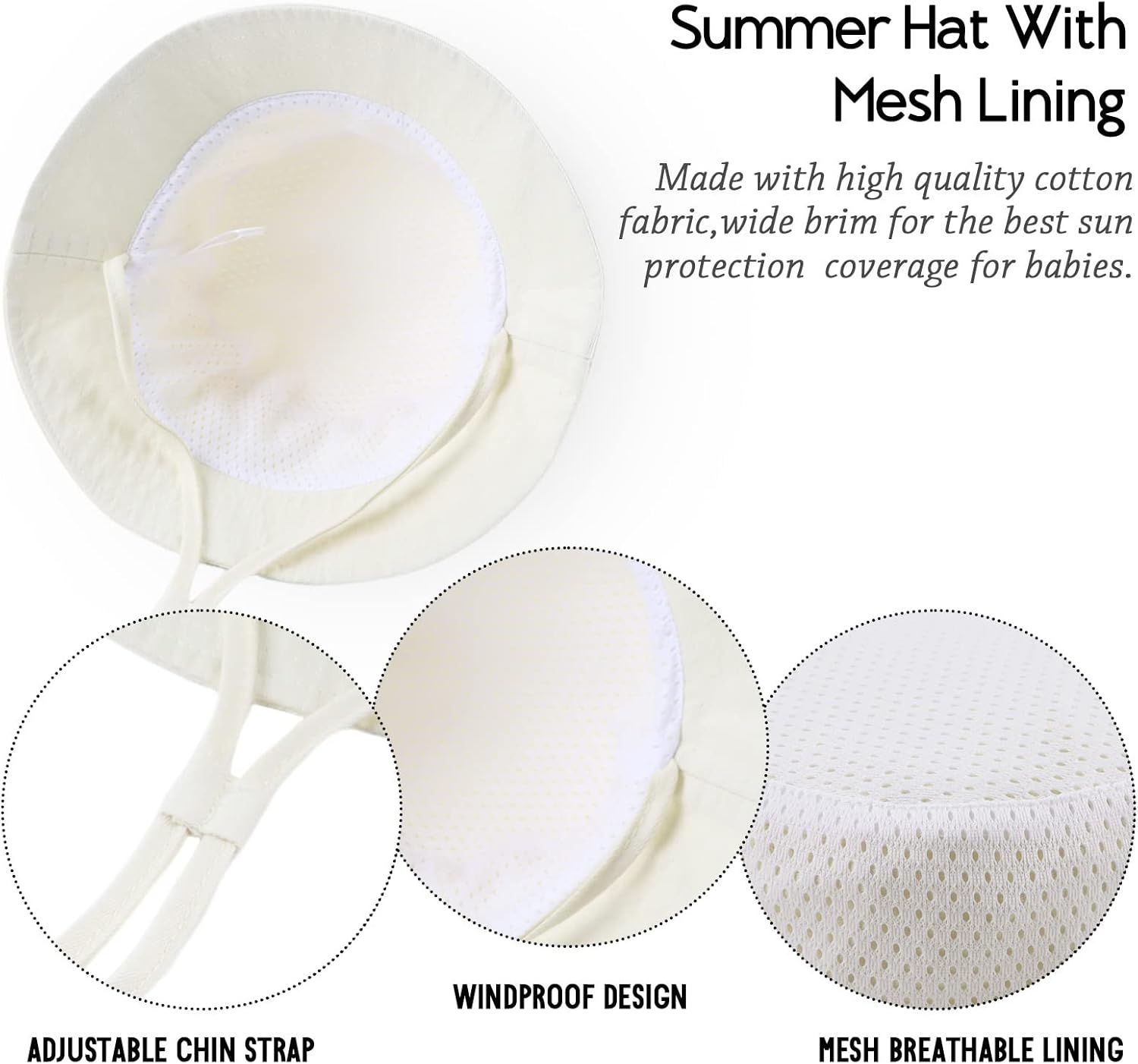 • MATERIAL: The cute baby sun hat made of 100% cotton the exterior and polyester mesh lining . The tailored design ensures that it is breathable and comfortable, and also providing an ideal environment for our cherished babies to grow. It is recommended to use a mild, neutral detergent and wash it gently with cold water, preferably by hand.