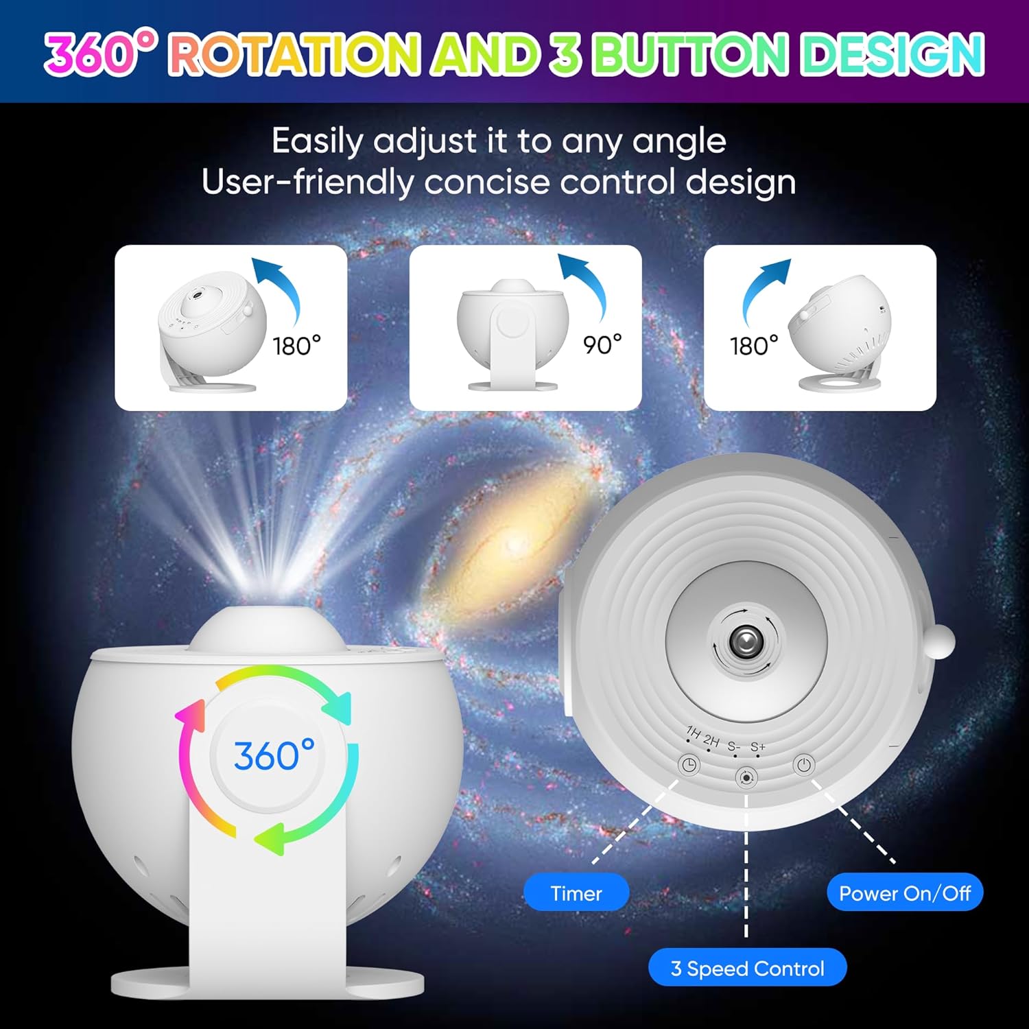 - Super Quiet & Auto-Off Timer : This star projector galaxy light wonβt make any noise while working. Never worry about forgetting to turn off the galaxy night light projector, as it has a timing shutdown function. Galaxy lamp can create a warm and quiet sleeping environment to help you and your child fall asleep. Note that the rotation of the projected image is a little slow which is designed specifically to simulate the real rotation of the starry sky.