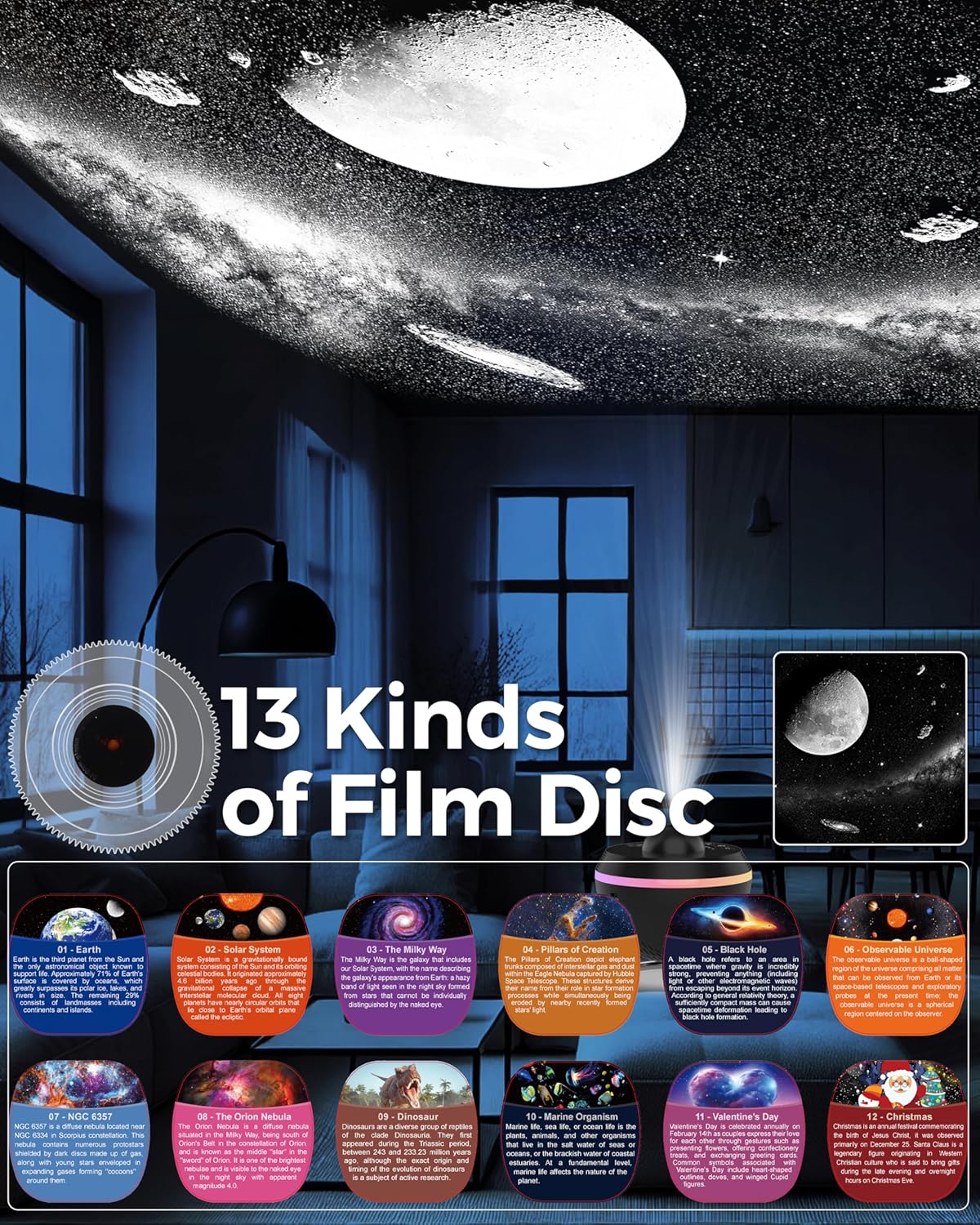 - 【Upgraded 13 in 1 Galaxy Projector】Galaxy Projector for Bedroom come with 13 different conten film trays: 1-Earth, 2-Solar System, 3-The Milky Way, 4-Pillars of Creation, 5-Black Hole, 6-0bservable Universe, 7-NGC 6357, 8-The Orion Nebula, 9-Dinosaur, 10-Marine Organism, 11-Valentine's Day, 12-Christmas, 13-Moon(In-built).Kids will be mesmerized by the prehistoric giants, underwater creatures, solar system and the moon, sparking their imagination and curiosity. For special holidays, the Planetarium Projector casts romantic Valentine's scenes and festive Christmas images, creating a warm and joyful atmosphere.