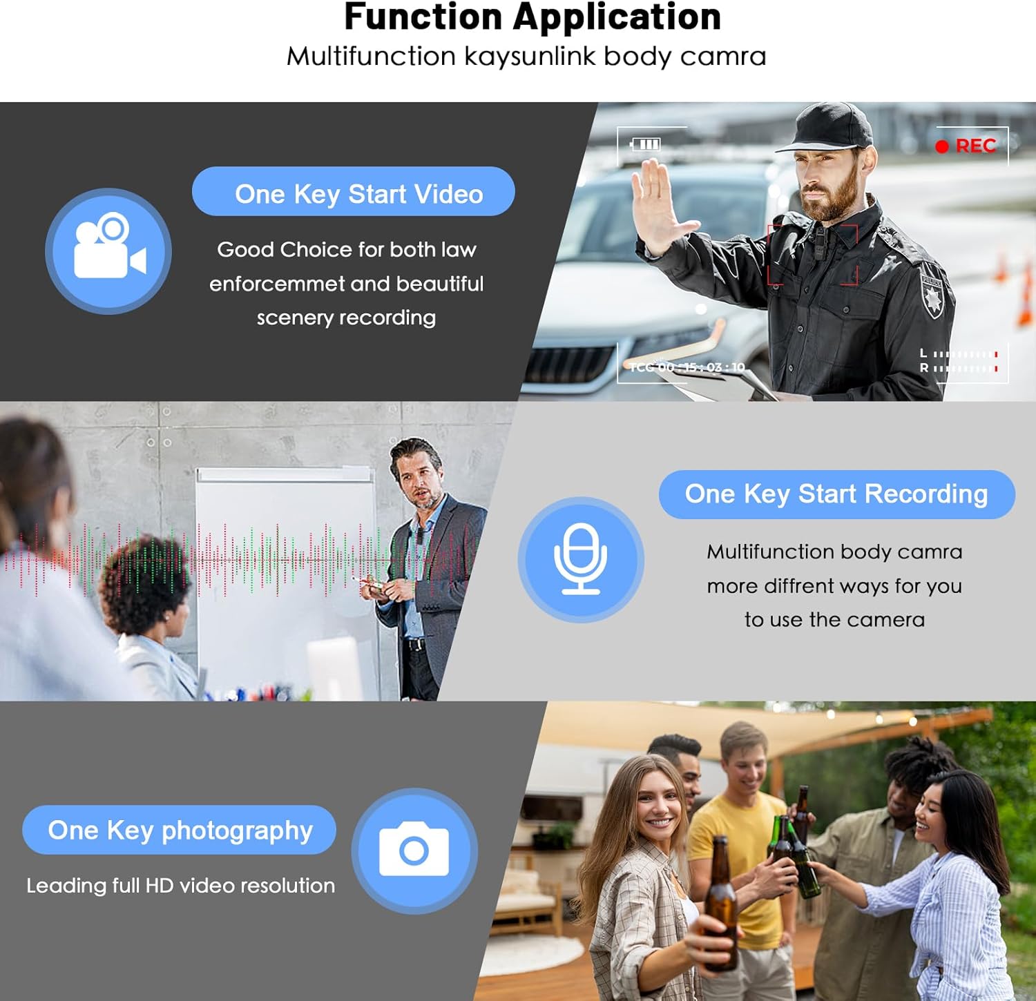 - 【Multifunctional Application】Kaysunlink Mini Body Camera is lightweight & compact,It can be used almost anywhere, Climbing, skiing, cycling, hiking, surfing. It's portable that can either be clipped on your backpack or put in your pocket. Perfect for Hiking, Driving Record, Meeting Record,Outdoor sports.