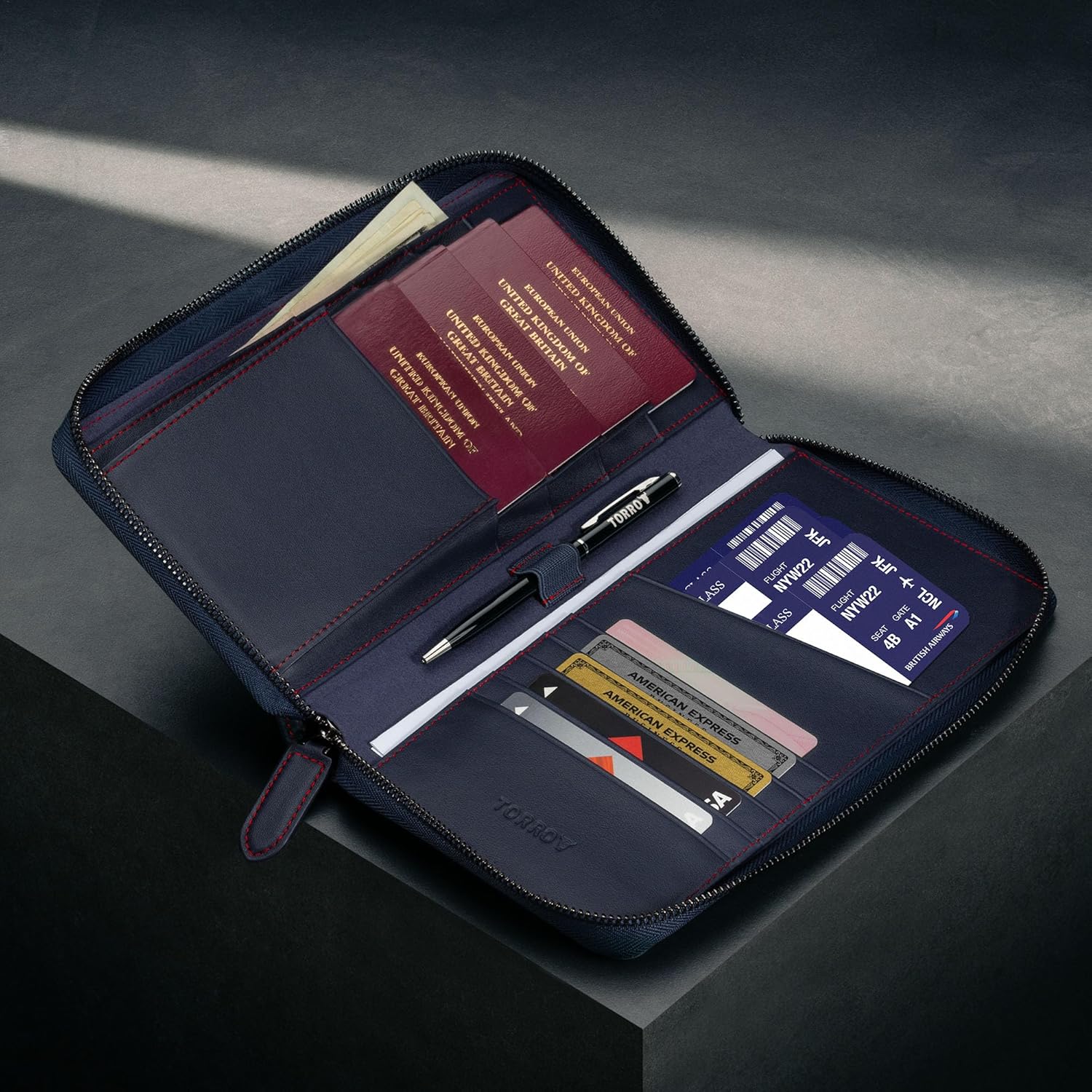 TORRO Premium Leather Family Travel Wallet, RFID Blocking Travel Organizer, Family Passport Holder for 4 Passports, Travel Documents and Cards (Navy Blue)