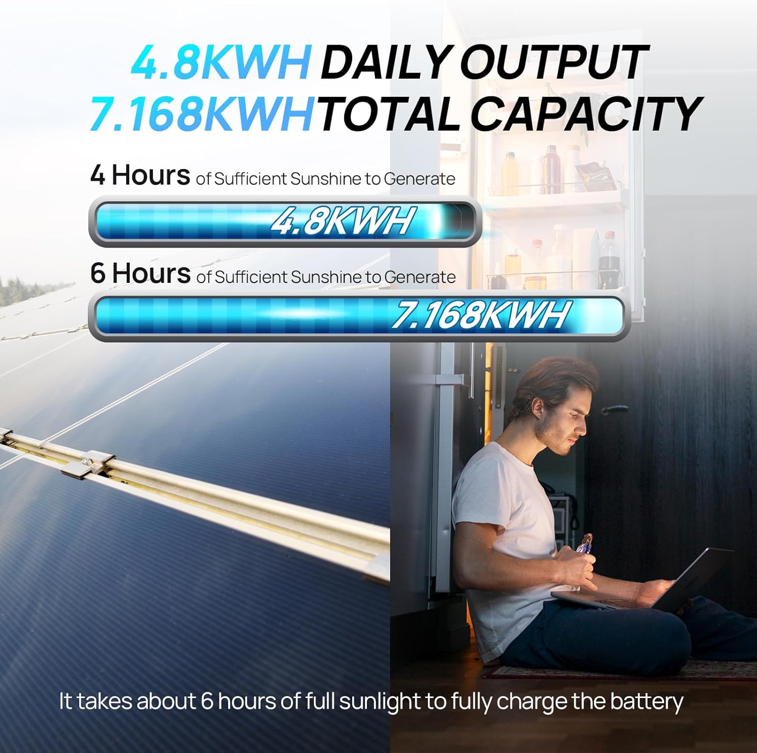 - [Storage 7.168KWH]: Utilizes 7168Wh dual pack 12.8V 280A Li-ion batteries with higher charging/discharging efficiency and more than 6000 times deeper cycles than lead-acid batteries. Built-in BMS chip (Battery Management System), in the protection of the battery at the same time, also makes your use more secure and more assured!