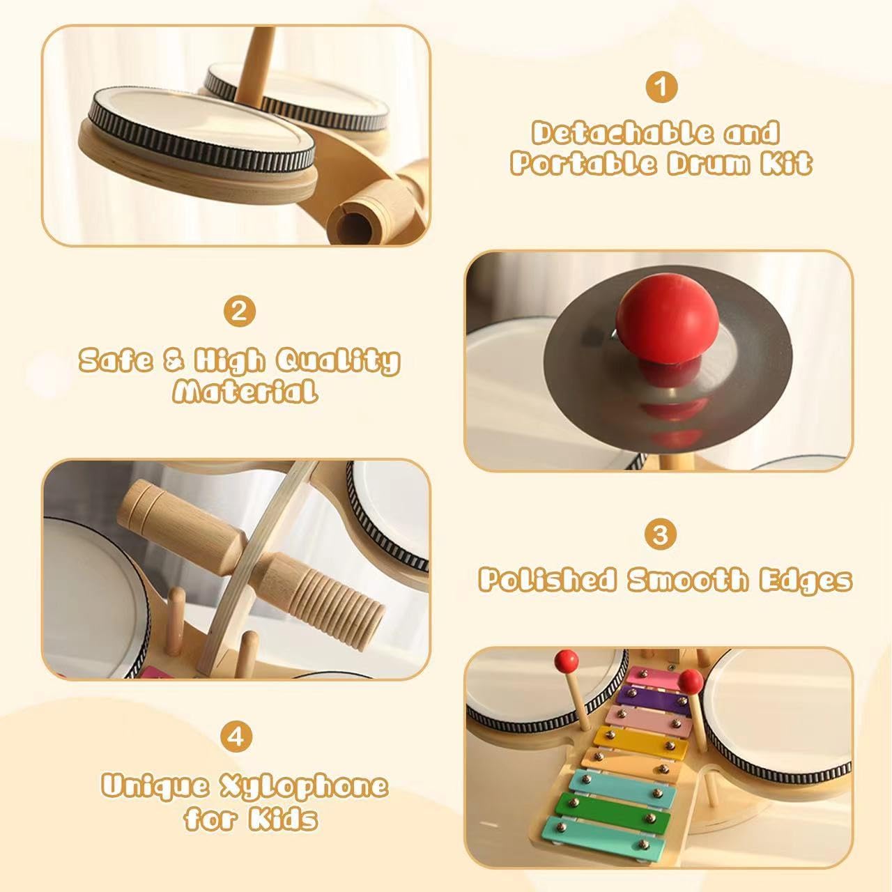 - [SAFE AND HIGH QUALITY MATERIALS]: The KIDS Drum Set is CPC and CE certified. And it is made from high quality natural wood, which is free from paint and coatings.Each corner has adopted a rounded process and there will be no sharp or rough parts to hurt your baby's hands.It is the perfect learning music toy for boy musicians and girl musicians, inspire your child's musical talent by happily drumming and playing the xylophone.