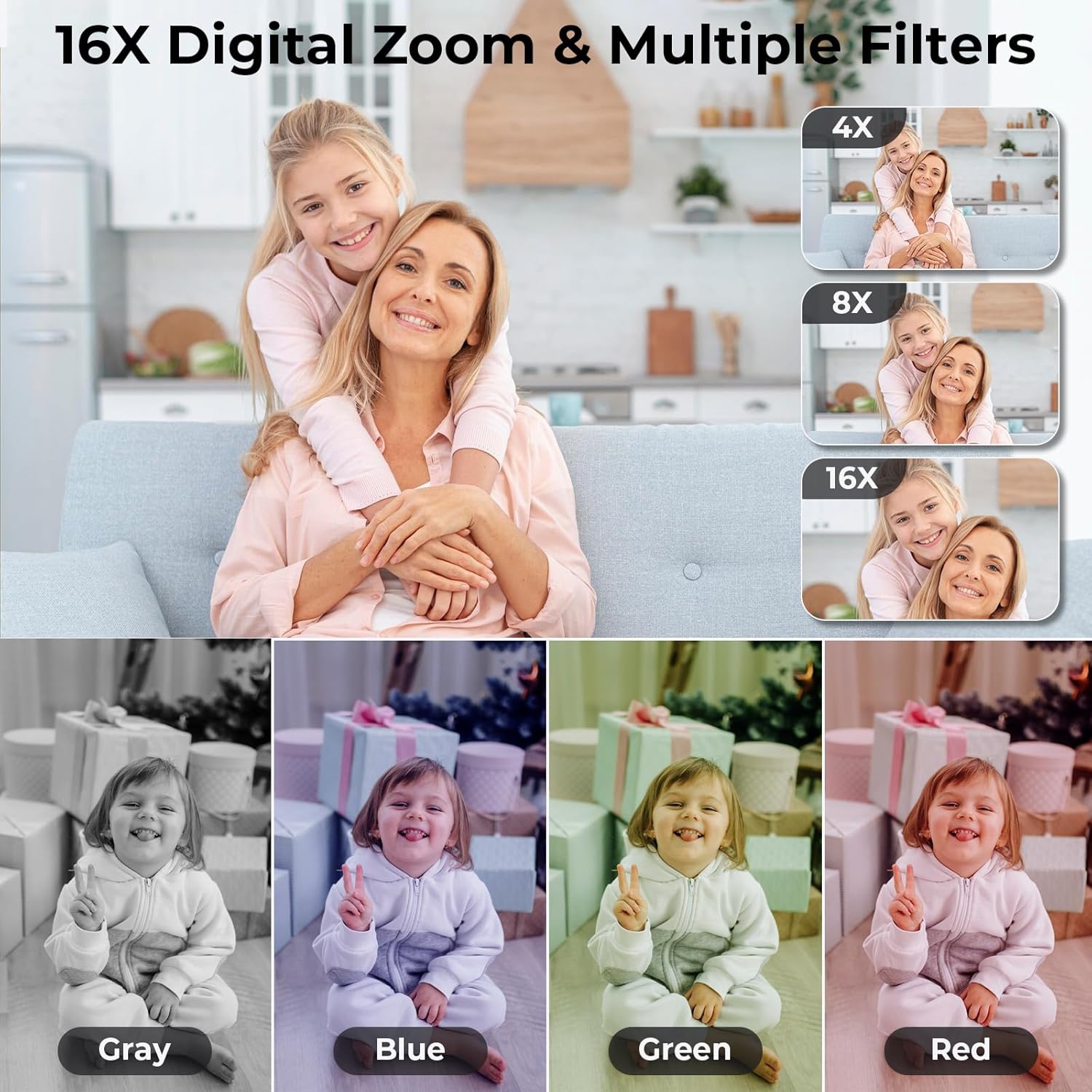 - Smart Auto-Focus & 16x Zoom: This toddler camera's face recognition and auto-focus features let you capture clear, vivid images every time, with precise face positioning and focus. You can also use the “W/T” button to adjust the 16x digital zoom to shoot distant objects and explore more details!