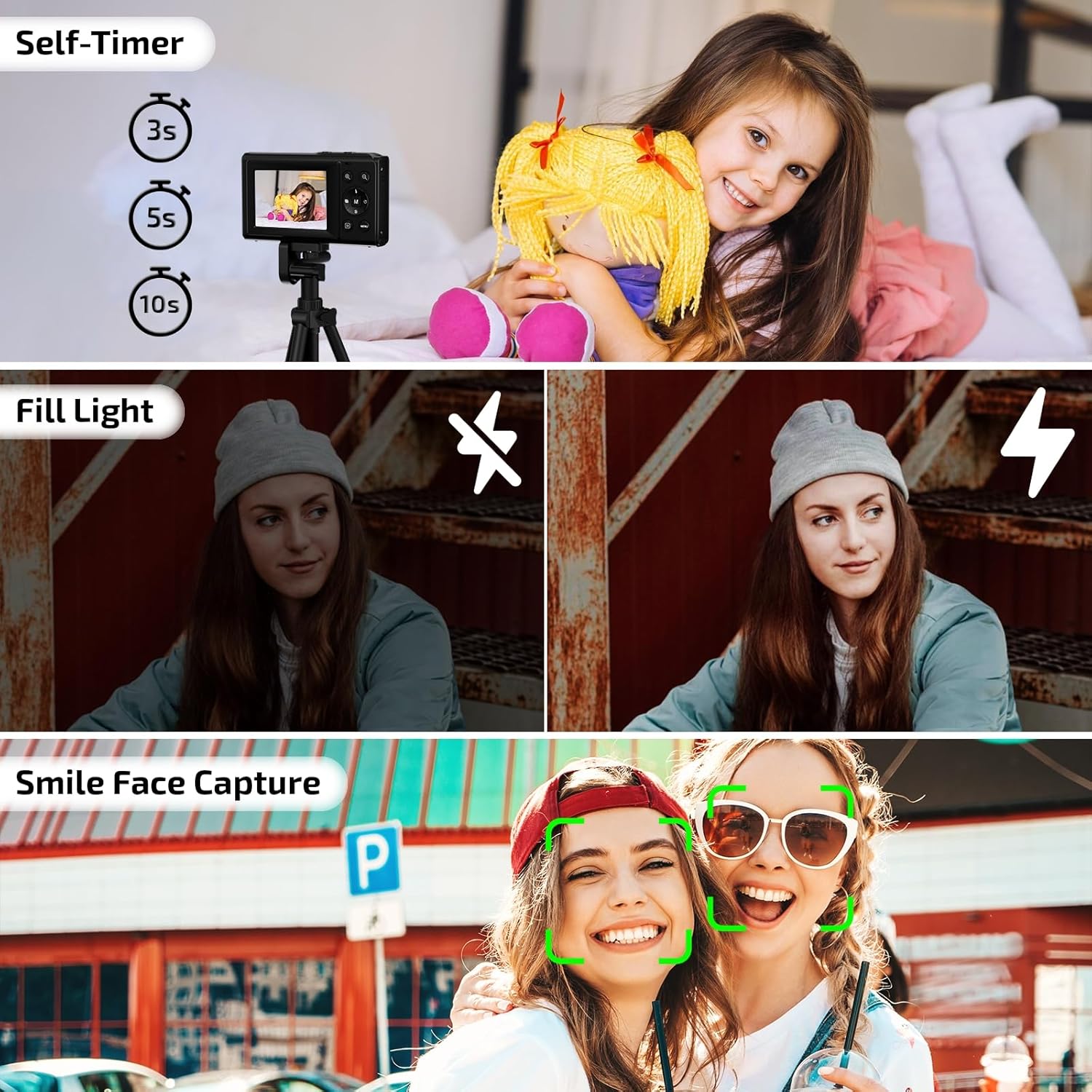 - Capture Stunning Moments with Ease: Small Camera features an advanced CMOS image sensor, delivering 4K video and 44MP photos—so you can snap vivid, lifelike images in an instant. Just press the shutter for one second, and let the camera do the rest.Perfect for beginners and kids, it’s effortless fun!
