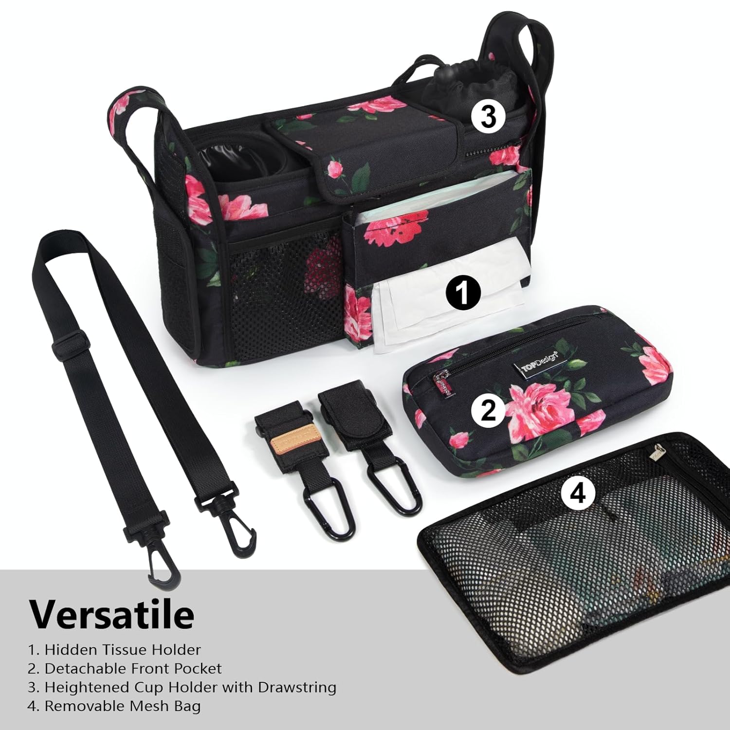 TOPDesign Universal Baby Stroller Organizer, Stroller Caddy with Detachable Mesh Bag & Heightened Insulated Cup Holders & Non-Slip Secure Hooks Accessories, Fits Most Strollers (Peony)