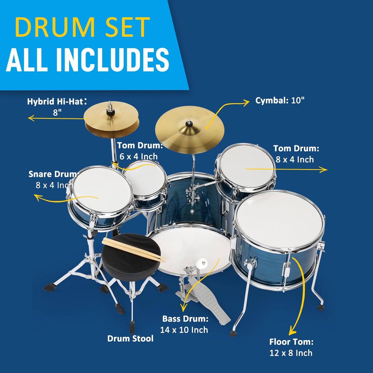 Ktaxon 5-Piece Complete Junior Drums Set, 14 Inch Beginners Drum Kit with Throne Stool, Pedal & Drumsticks, Kids Drums Musical Instruments W/Cymbal, Hi-Hat, Floor, Tom and Snare Drum (Brushed Blue)
