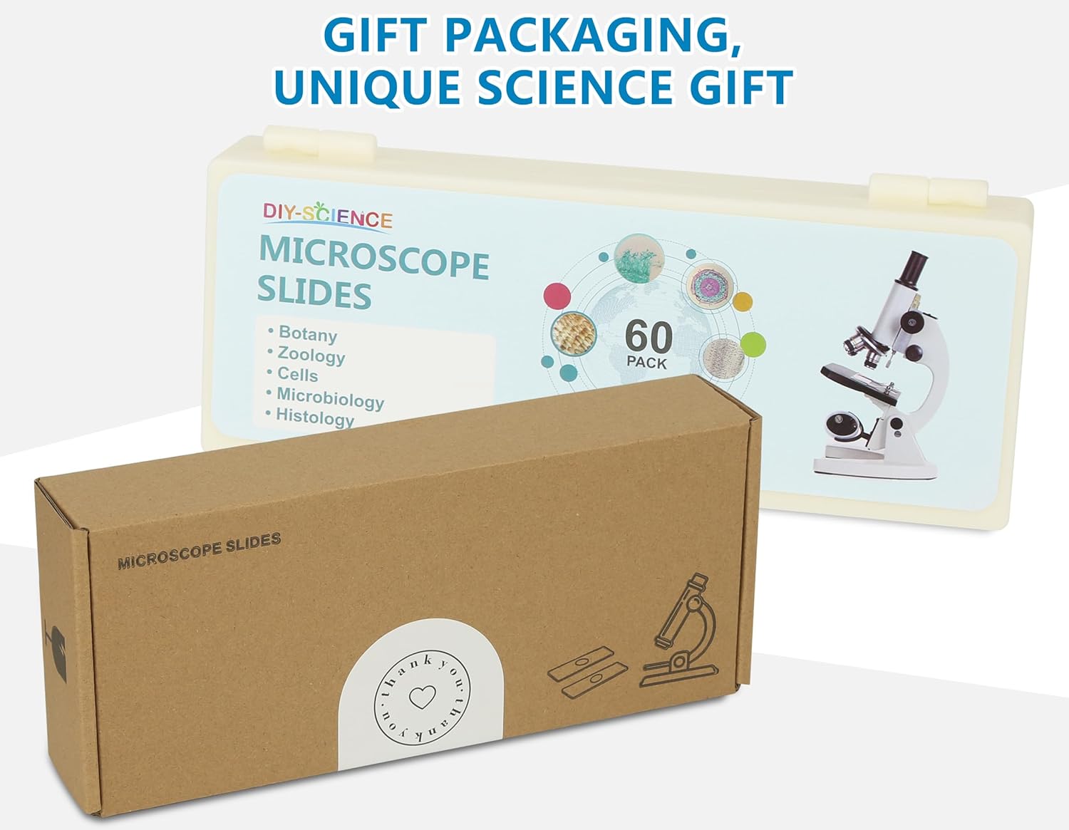 Microscope Slides with Specimens for Kids, 60 Lab-Grade Prepared Microscope Slides, Animal/Plant/Microbe/Tissue Samples, STEM Biology Kit for Homeschool, Classroom Labs & Science Education