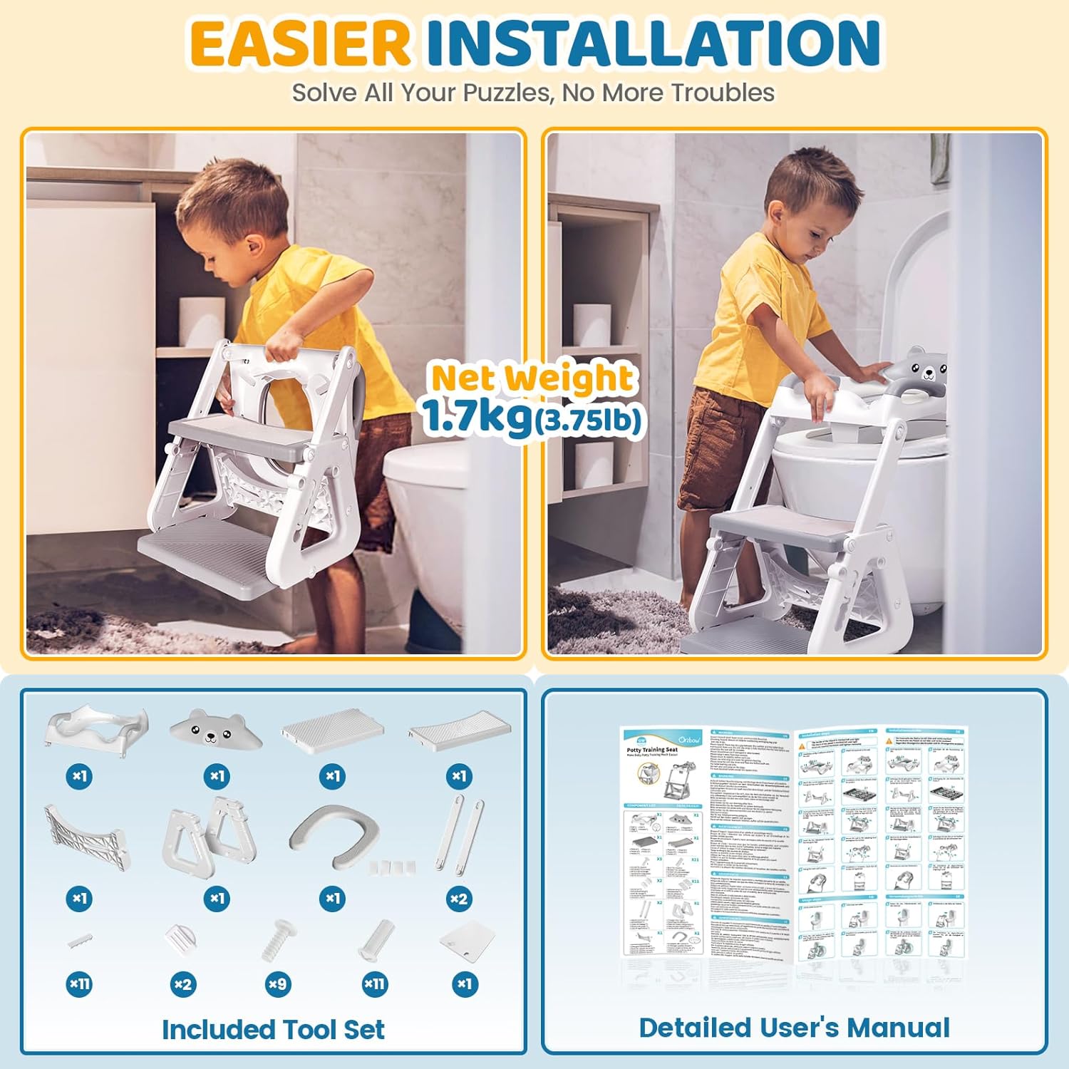 Orzbow 2-IN-1 Potty Training Toilet Seat with Step Stool for Toddler, Stability Training Potty Seat for Kids Boys Girls with Splash Guard and Anti-Slip Pad, Adjustable Ladder & Potty Seat Height, Grey