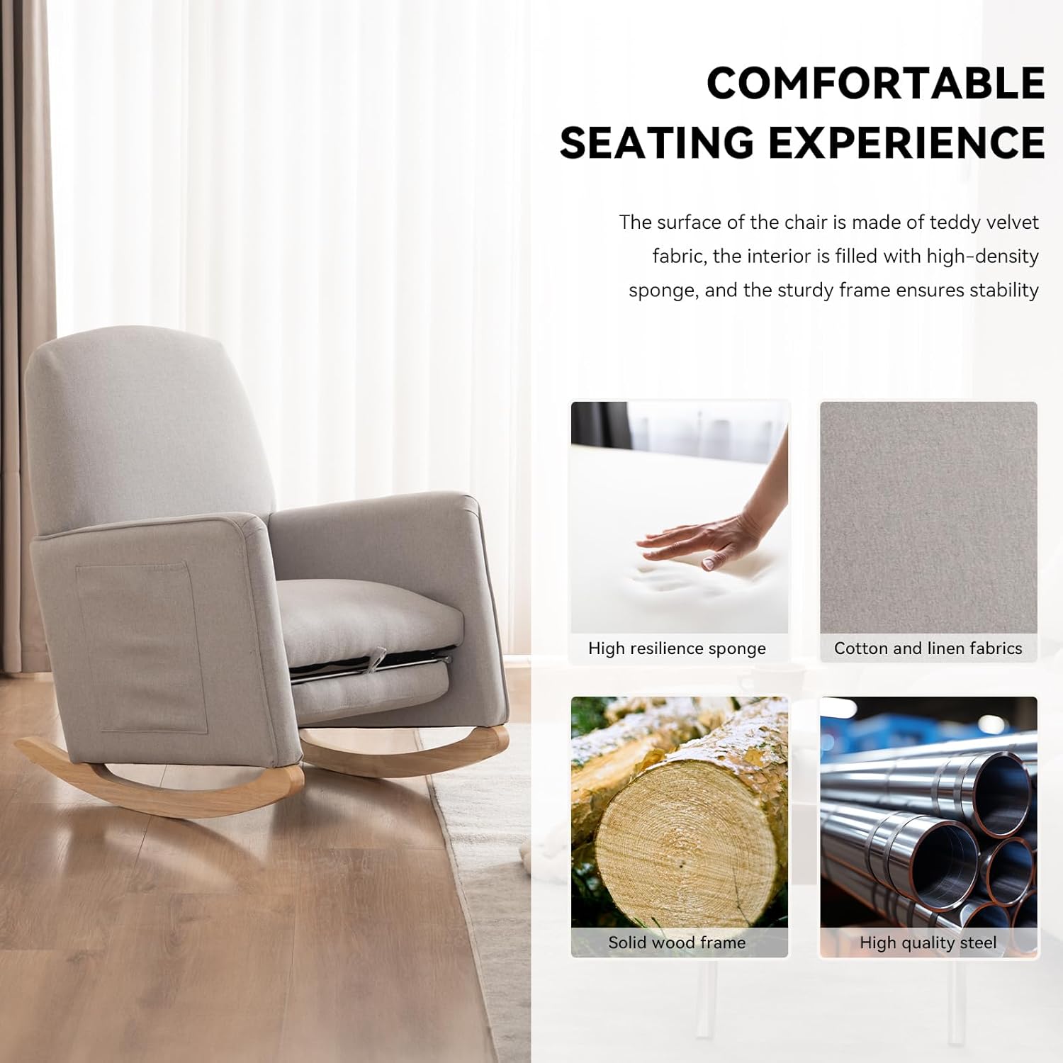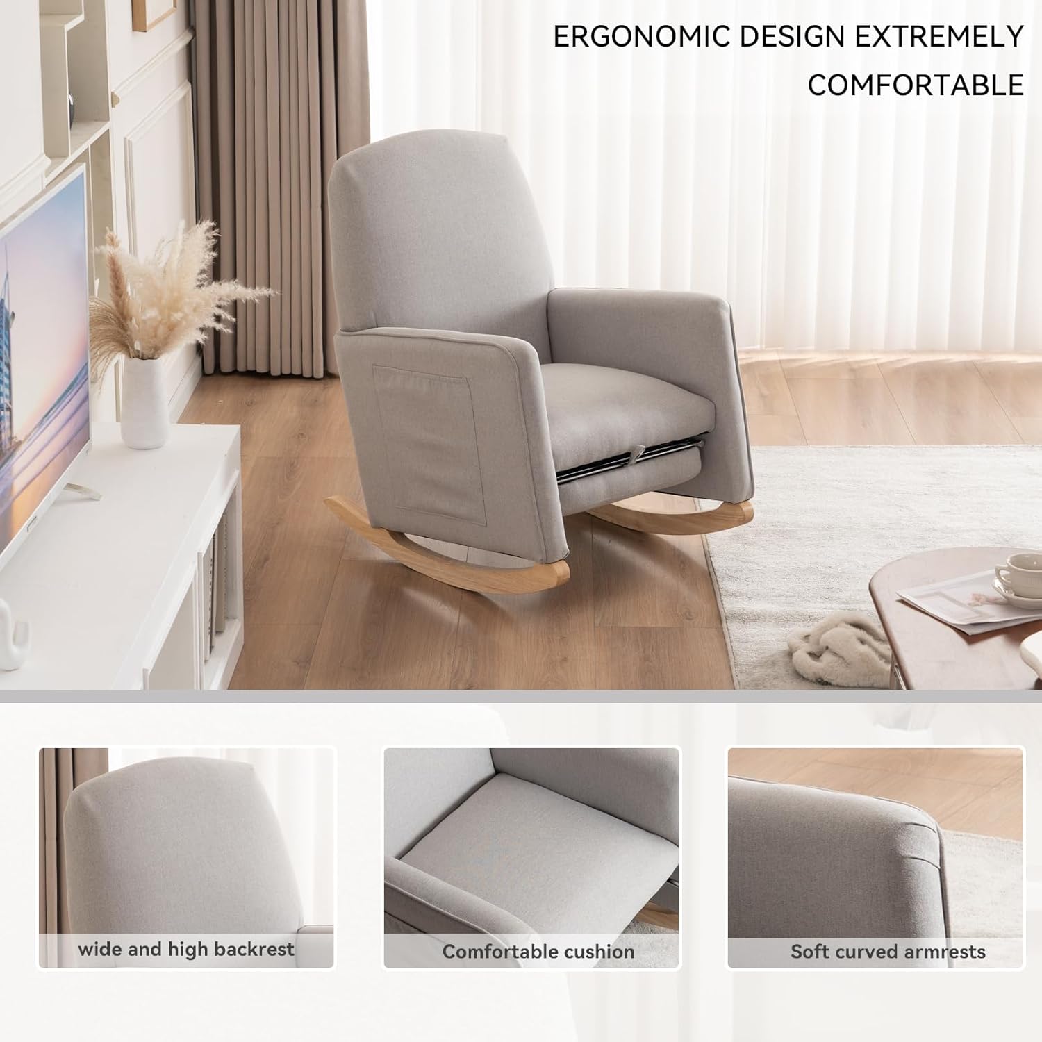 - High-Quality Soild Wood Base:Covered with quality cotton linen fabric, the surface is breathable and easy to maintain. The frame is made of solid plywood and thickened rubber wood base, which is very solid and durable. Extra wood strips between the two legs make the frame more stable and can withstand a weight of 300 lbs. Curved, non-slip solid wood rubber legs allow the chair to rock without wearing down the floor and making noise