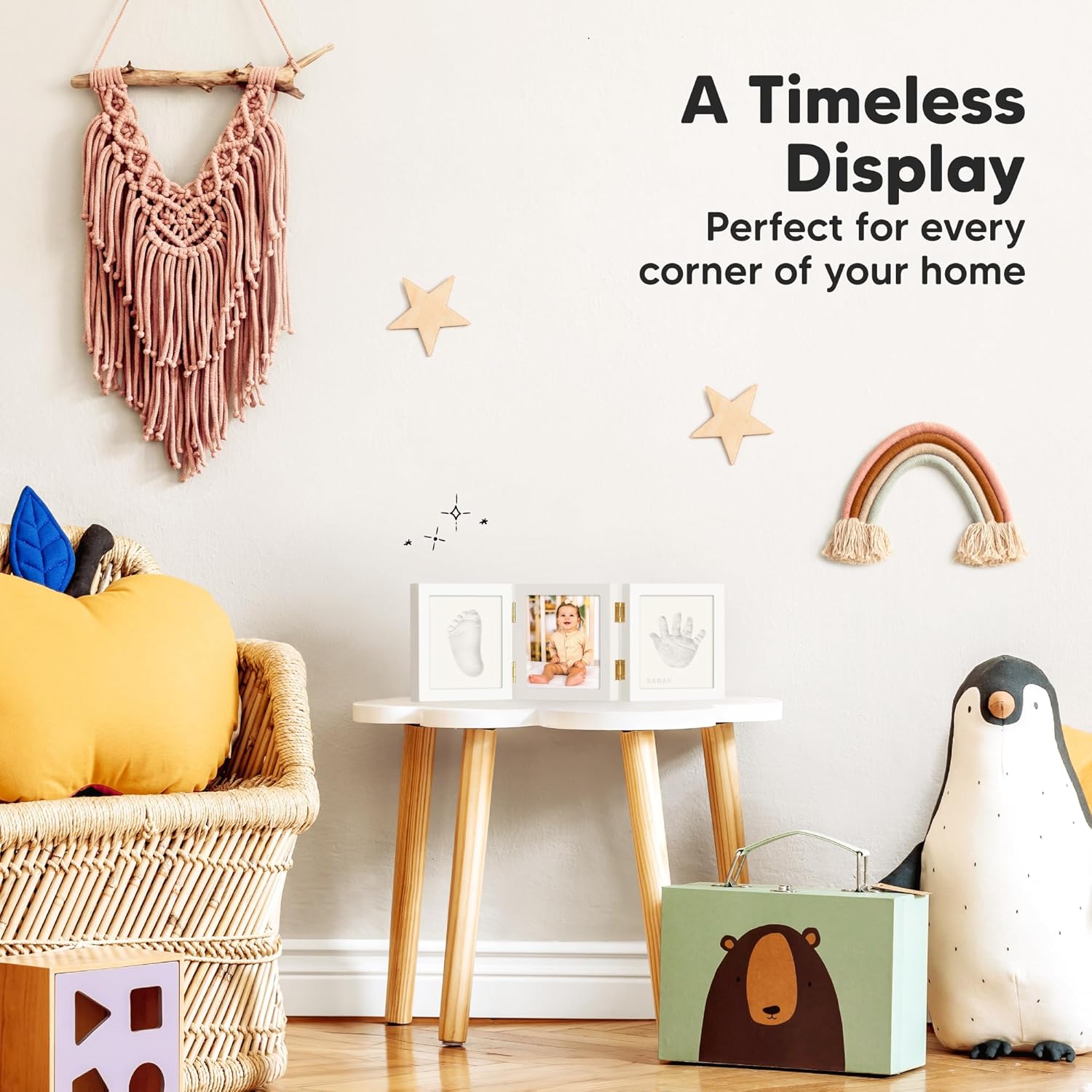 - Sturdy Wood Frame, Real Glass Cover - Our tri-fold baby handprint footprint keepsake kit maintains its pristine condition for years to come. Itβs a lovely, everlasting newborn keepsake for your baby room decor. A must-have newborn baby essentials.