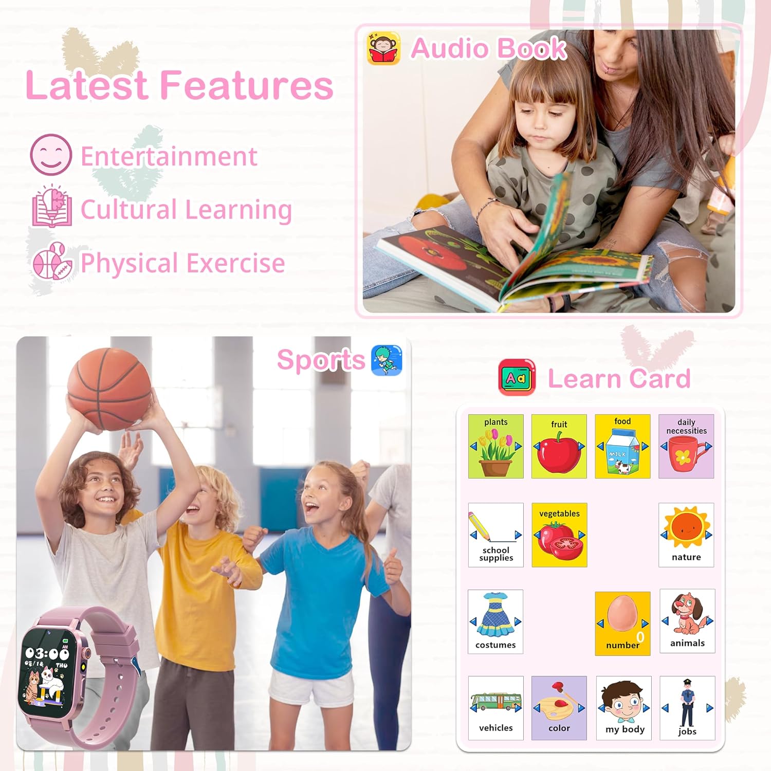 - ăUpgraded Multifunctional Kids WatchăThe latest kids smart watch has a smoother HD screen and finer craftsmanship. And the smart watch for kids offers a range of interesting and practical functions, including 32 games, habit tracking, camera, video, pedometer, alarm, torch, learning cards, audiobook, music, calculator, stopwatch etc.