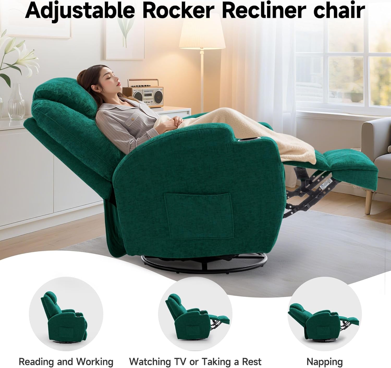 Recliner Chair, Rocking Recliner Chair for Adults with Massage and Heat, Swivel Rocker Recliner with Remote and Cup Holder, Cashmere Manual Recliner for Nursery, Living Room, Green