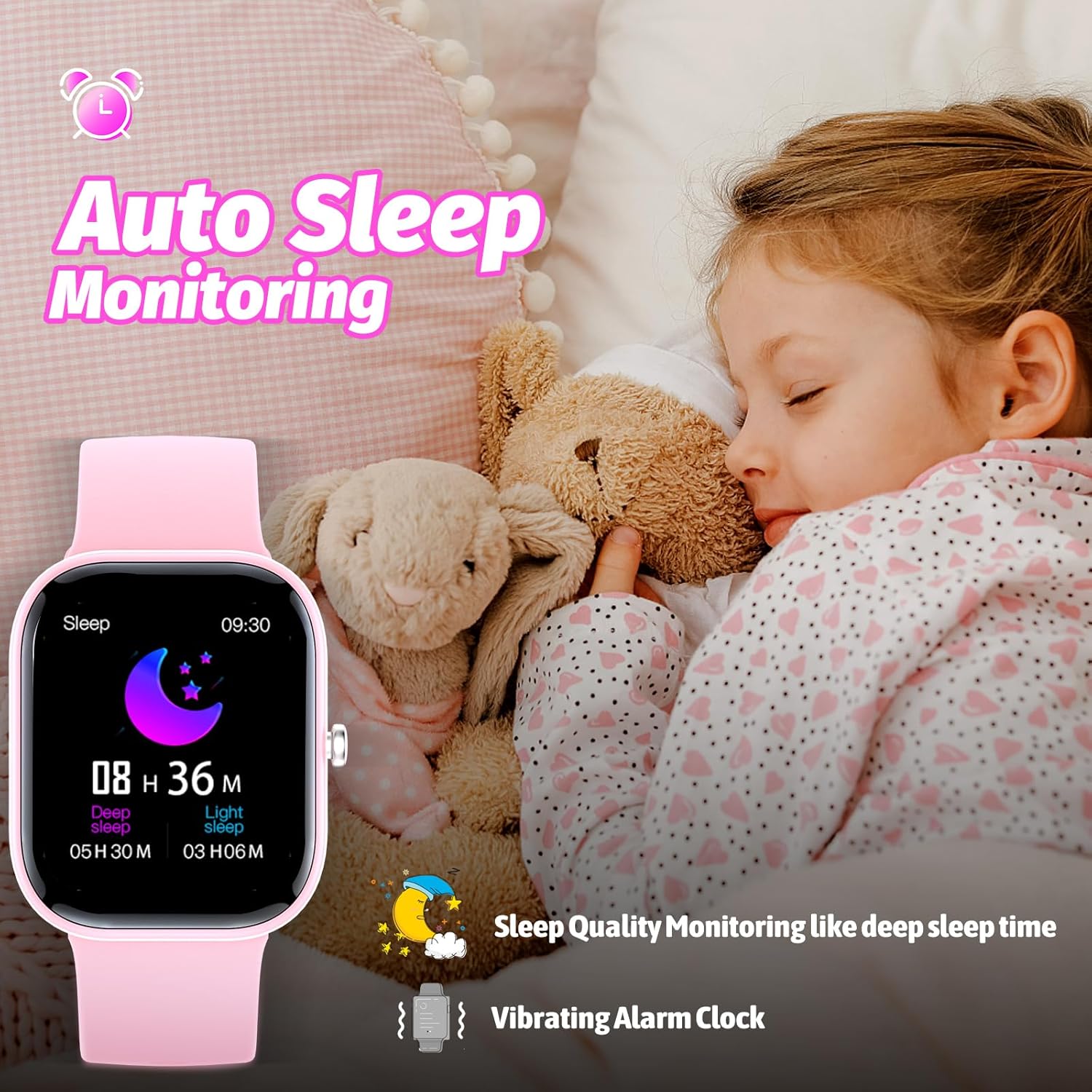 - All-NIGHT SLEEP TRACKING & 15+ VIBRATING ALARM CLOCK :This kids watches for girls can automatically monitor your child's daily real-time activities, like deep sleep, light sleep time, number of awakenings. The vibrating alarm clock can wake up your child without disturbing others, helping him/her develop a healthy sleep routine. There are also many reminders, such as sitting and drinking water