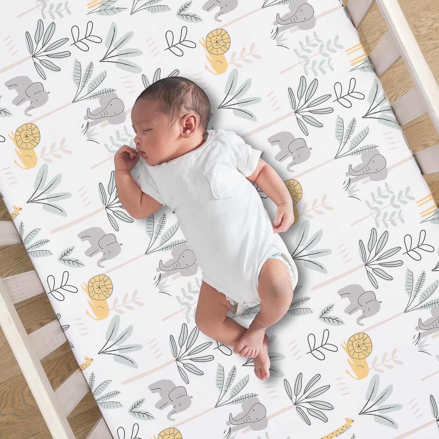 - Breathable 100% cotton fitted crib sheet with lions, giraffes, elephants and foliage