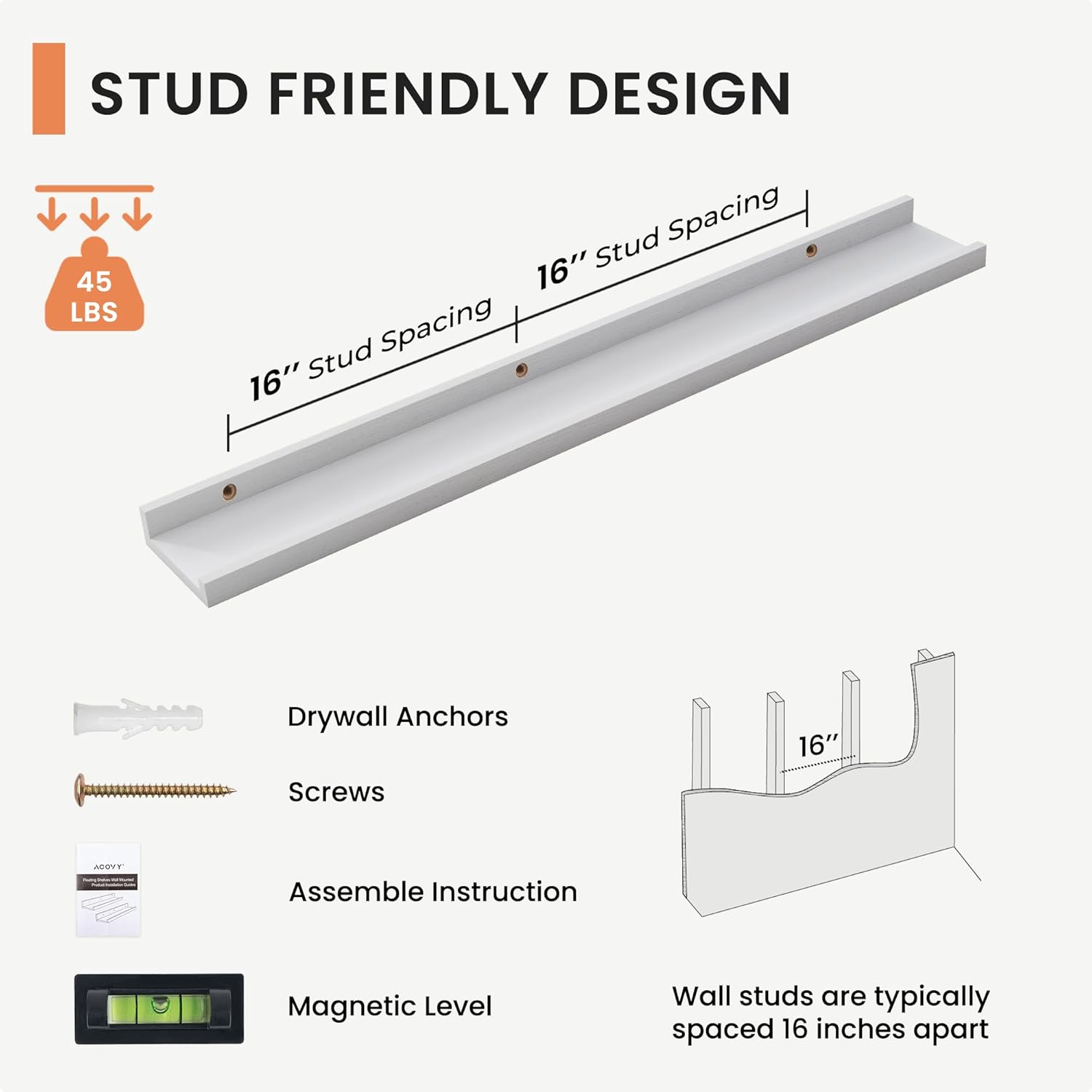 - Secure and Reliable: The mounting holes are expertly spaced at 16 inches to align perfectly with wall studs, ensuring a secure installation. Each wall shelf supports up to 45 lbs, This thoughtful design guarantees that your floating shelf with lip are anchored safely, offering stability and peace of mind for displaying any of your favorite items