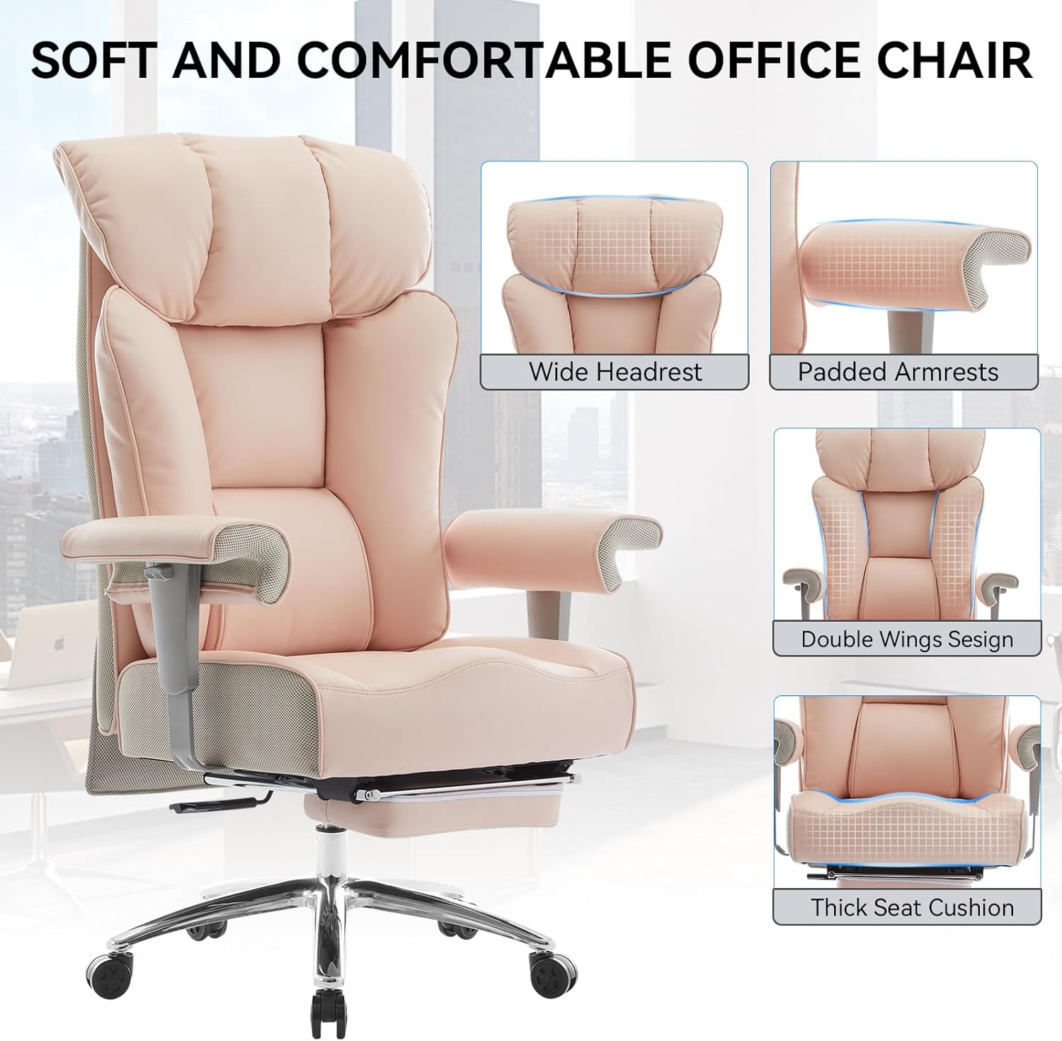 Efomao Big and Tall Ergonomic Office Chair 450LBS with Foot Rest, High Back PU Leather Executive Chair with Adjustable Padded Armrests, Lumbar Support for Home or Work, Heavy Duty Computer Chair, Pink