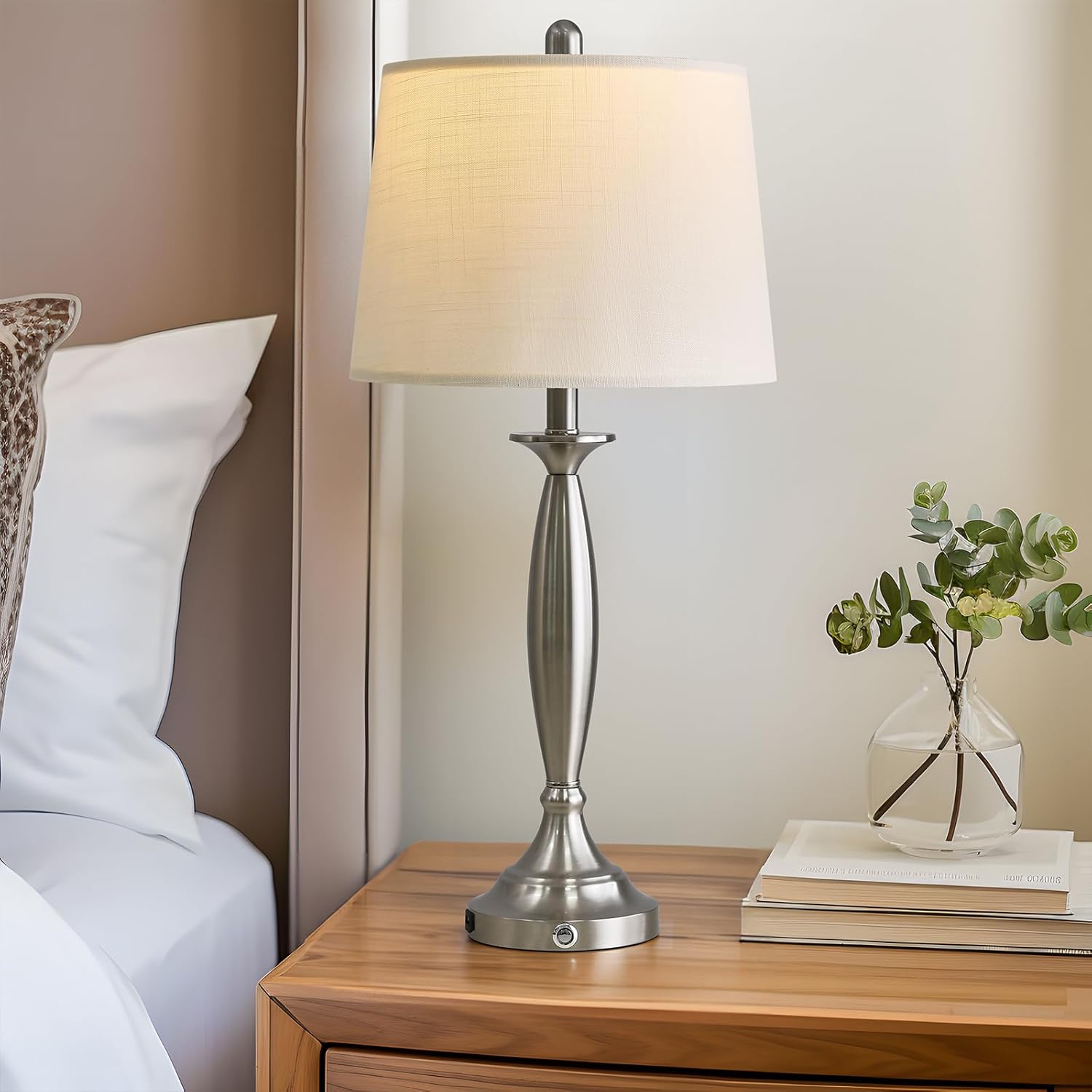 - Minimalist &Modern Design: The set of 2 bedside lamps are constructed of high-quality silver metal base and linen fabric lamp shades that provide a modern feeling aesthetic. Table lamp for living room is perfect in living room bedrooms, bedside, café, corridors, restaurants, etc. It displays a warm and beautiful atmosphere to a room.(Note: The shade needs to be assembled)