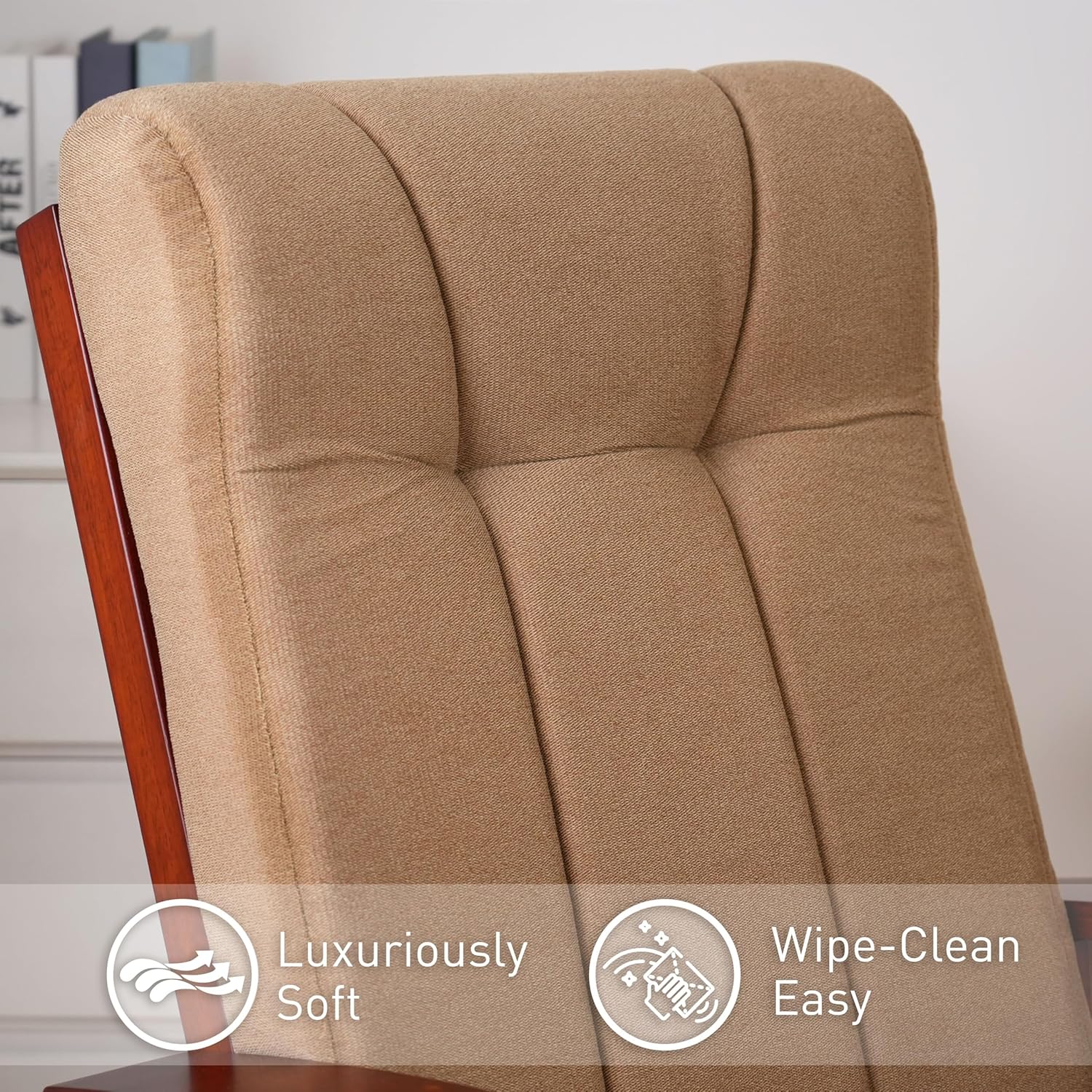 - Durable and Comfortable:Crafted from high-quality, wear-resistant rubberwood, this glider rocking chair features an ergonomically designed back cushion and armrests to ensure both durability and comfort.