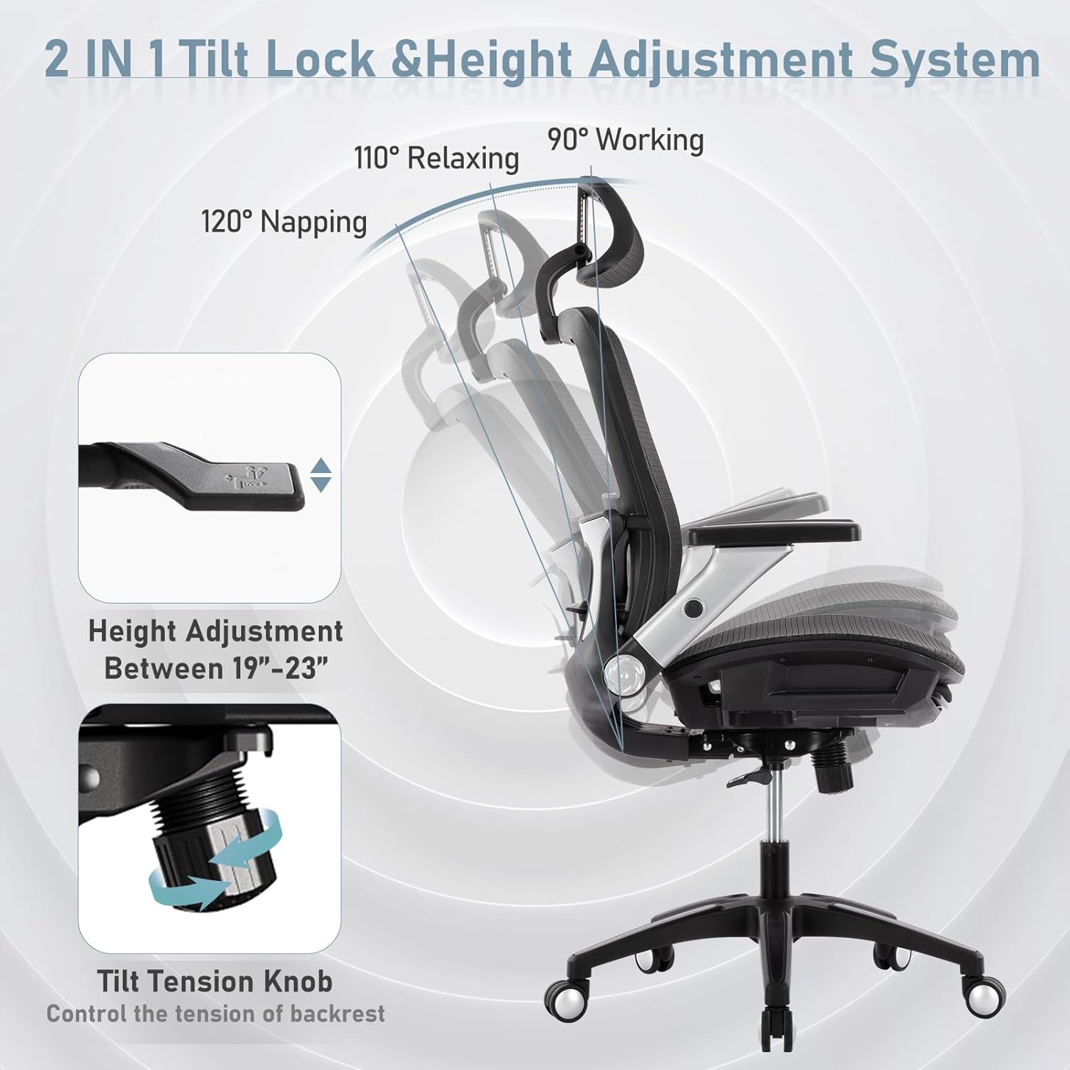 - RECLINE AND RELAX WITH EASE – TILT & LOCK SYSTEM:Relax in style with the reclining office chair with leg rest, featuring a 120° tilt lock and adjustable tension. Whether you need a break or a full recline, find your perfect angle effortlessly while staying comfortable and supported throughout your work or play.