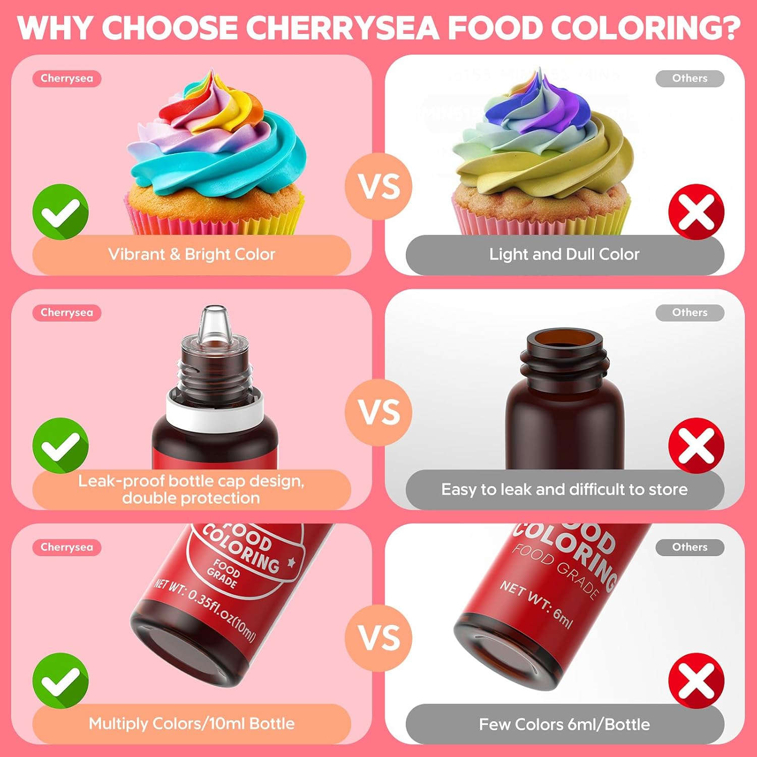 - Strong Tinting Strength - With upgraded highly concentrated formula water based texture,a little of these colors go a long way.The finished food is bright and rich in color, uniform and delicate.What’s more, the liquid food color will not evaporate with moisture when heated or frozen. This food coloring also can be mixed together to create new shades