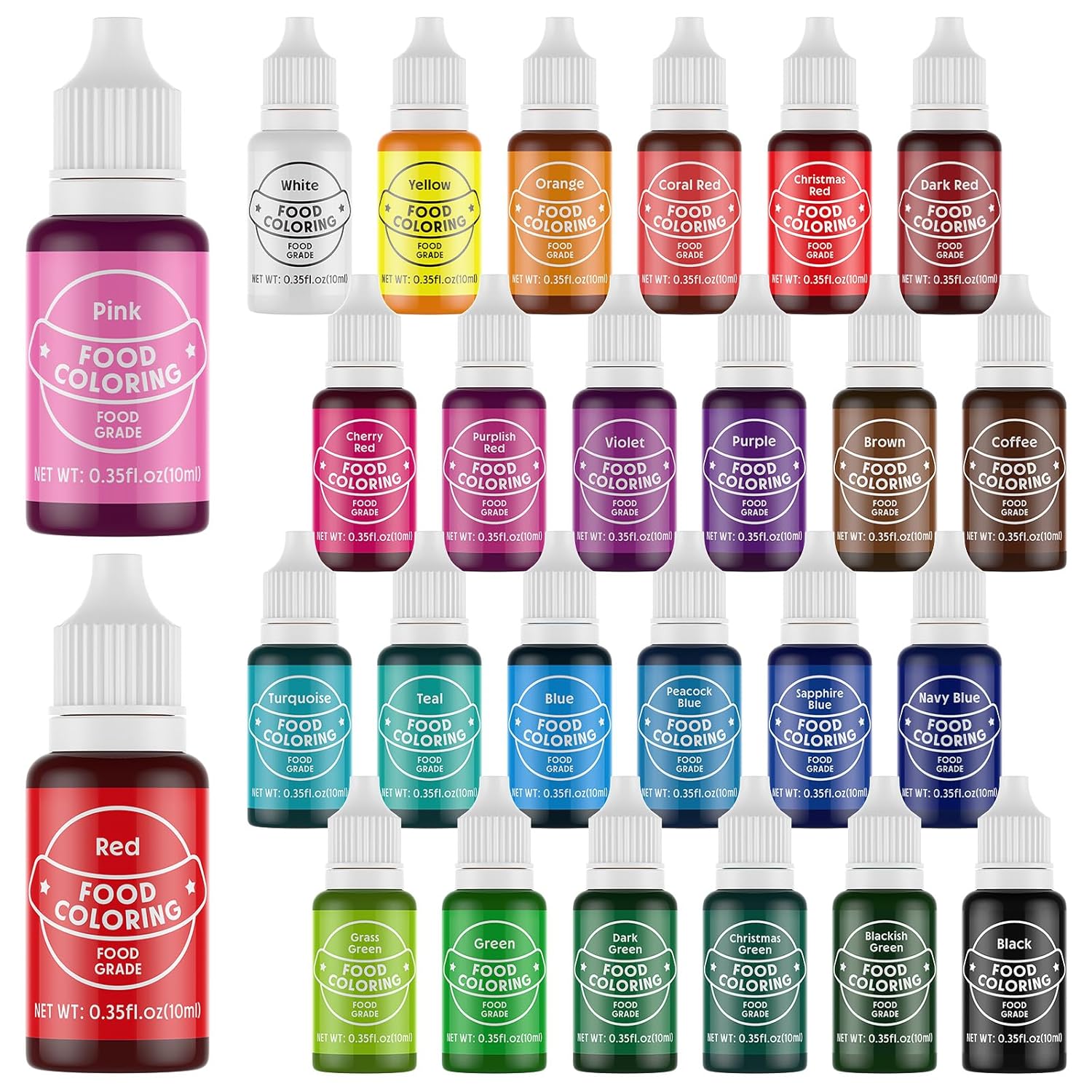 - Rich & Vivid Color Set - All colors are specially made by the Dessert Master,every color has its ingenuity.Our food coloring liquid set includes:Red,Violet,Yellow,Sky Blue,Green,Grape Purple,Pink,Brown,Black,Orange,Navy Blue,Grass Green,Dark Green,Teal,Cherry Red,Blackish Green, Purplish Red, Sapphire Blue, Peacock Blue, Coffee ,Coral Red, White, Christmas Red ,Christmas Green, Turquoise ,Dark Red.The most comprehensive food dye set are here
