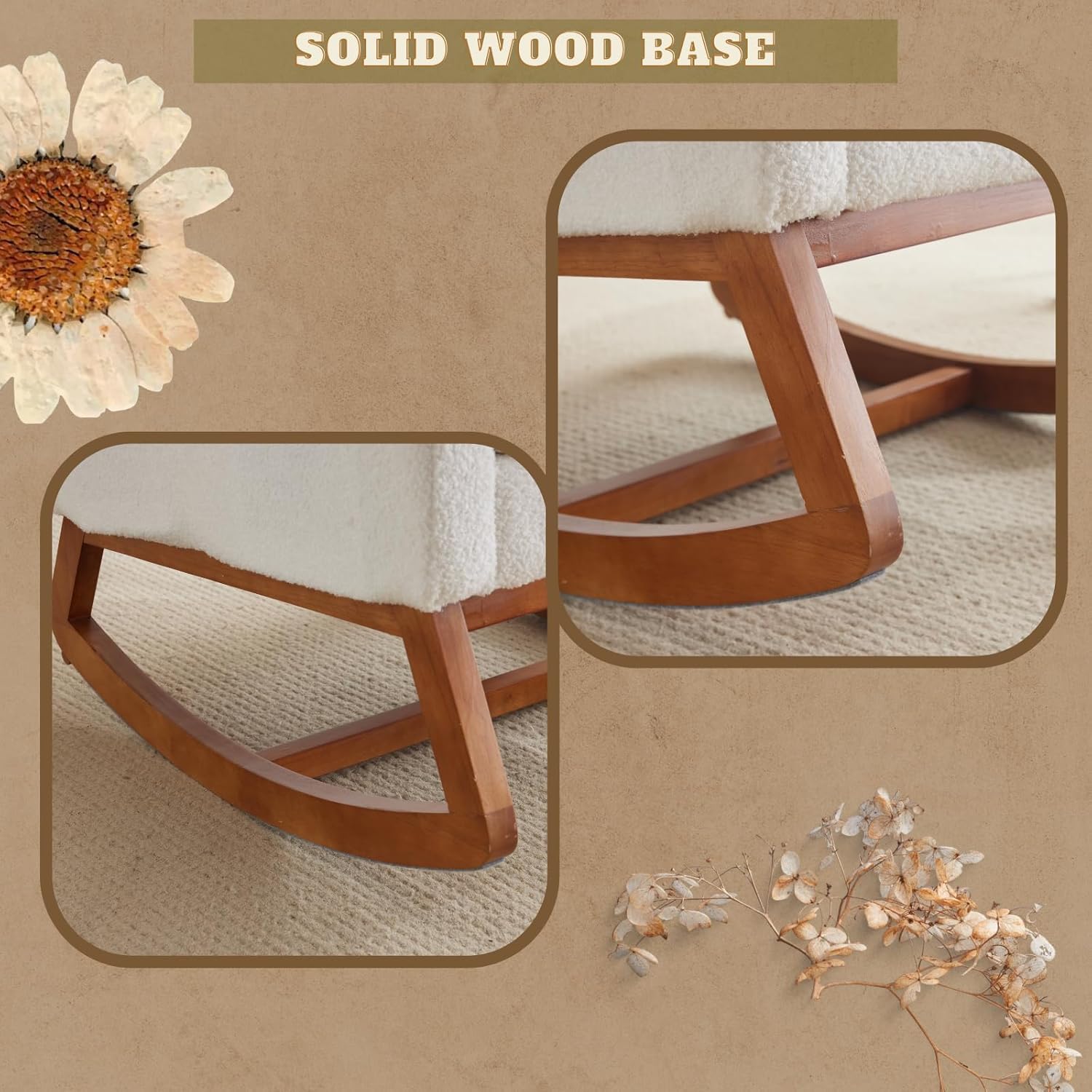 VINGLI White Teddy Fleece Rocking Chair Nursery with Thick Headrest, Upholstered Mid-century Modern Nursing Rocker Glider with Curved Armrest, Sturdy Solid Wood Base for Living Room,Bedroom, Baby Room