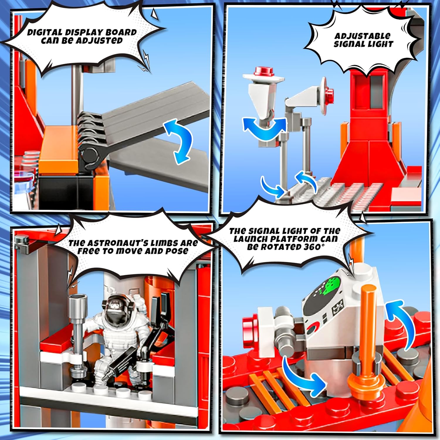 - COUNTLESS PLAY POSSIBILITIES: The Space Building Set comes with a city space rocket and a launch control tower, plus a console and equipment transport vehicles to transport the astronauts from the tower to space! Kids can open the model of rockets and aerospace aircraft doors to debug the driver. The robotic arm of the Rocket Tower can rotate 360 degrees flexibly, kids can also choose to build the space shuttle with an opening hatch that contains a removable satellite inside.