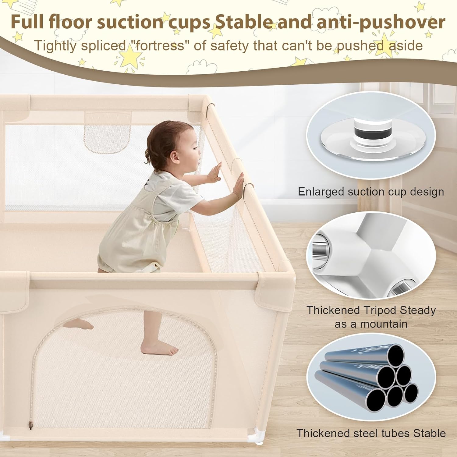 - 【EASY TO INSTALL AND STURDY STRUCTURE】 Abdtech extra large playpen is easy to install, no tools are needed, just follow the instructions and it can be installed in 10 minutes. The structure of the baby playards is sturdy, using slot or suction cups and other designs to ensure the stability of the baby's movement within the baby playpen. Baby Gate Playpen are often designed to prevent babies from reaching unsafe places in the home, such as stairs and electrical appliances, thus minimizing the risk of accidents.