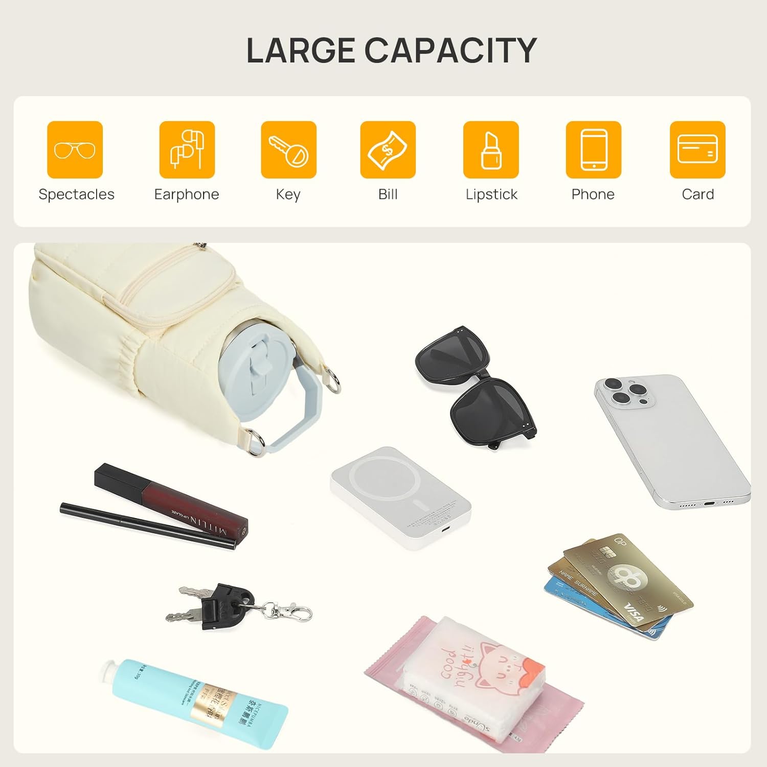 - Telena Water Bottle Bag: Made of high quality down fabric with adjustable vintage shoulder straps makes this water bottle holder classic yet stylish. The soft and waterproof down filled cotton material has better water and shock resistance while maintaining high softness and elasticity. Not only to prevent the water cup bump, but also wear light. Please note that this crossbody bag cannot be washed or machine washed
