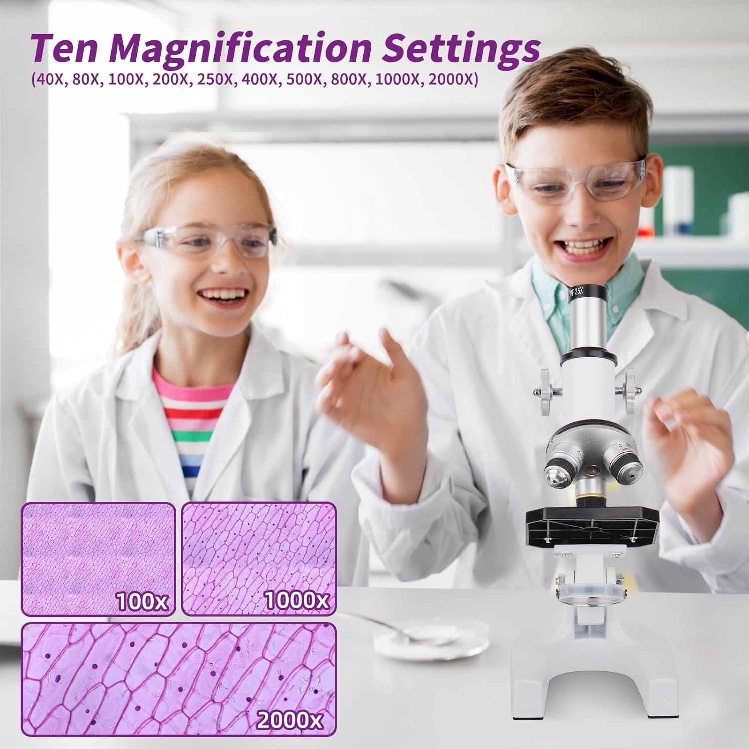 - Ten Magnification Settings: WF25X and 10X eyepieces alone or with 2X lens, cooperate 4x 10x 40x 185 metal achromatic objective lenses, biological microscopes offer 10 magnification settings, 40X, 80X, 100X, 200X, 250X, 400X, 500X, 800X, 1000X, 2000X