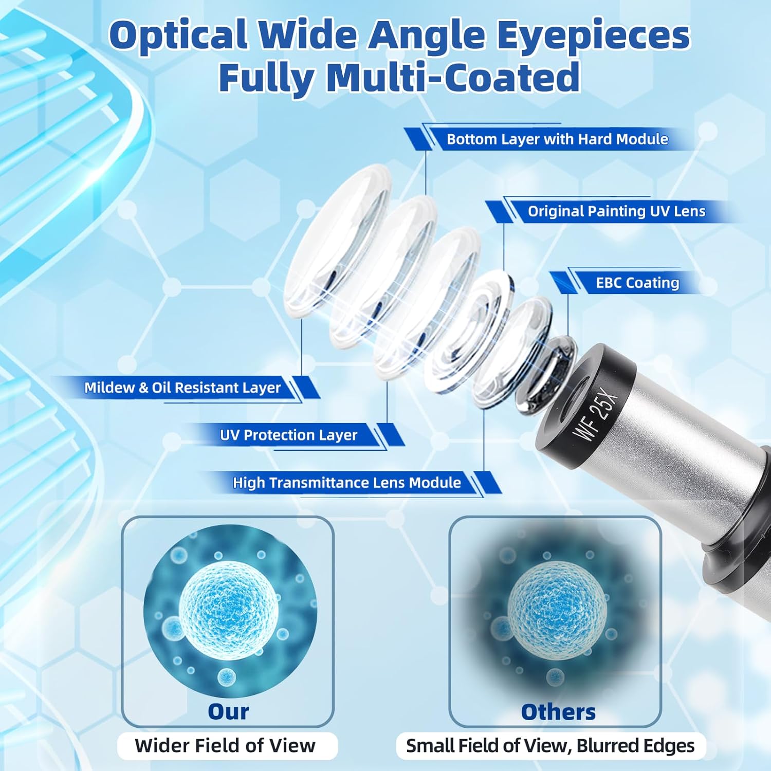 - Wide and Clear Vision: Optical wide-angle eyepieces can provide a wider field of view without dark edges. Fully Multi-Coated has a higher light transmittance, making the field of view clearer and brighter. The retractable objective lens can avoid damaging the sample when colliding with the sample