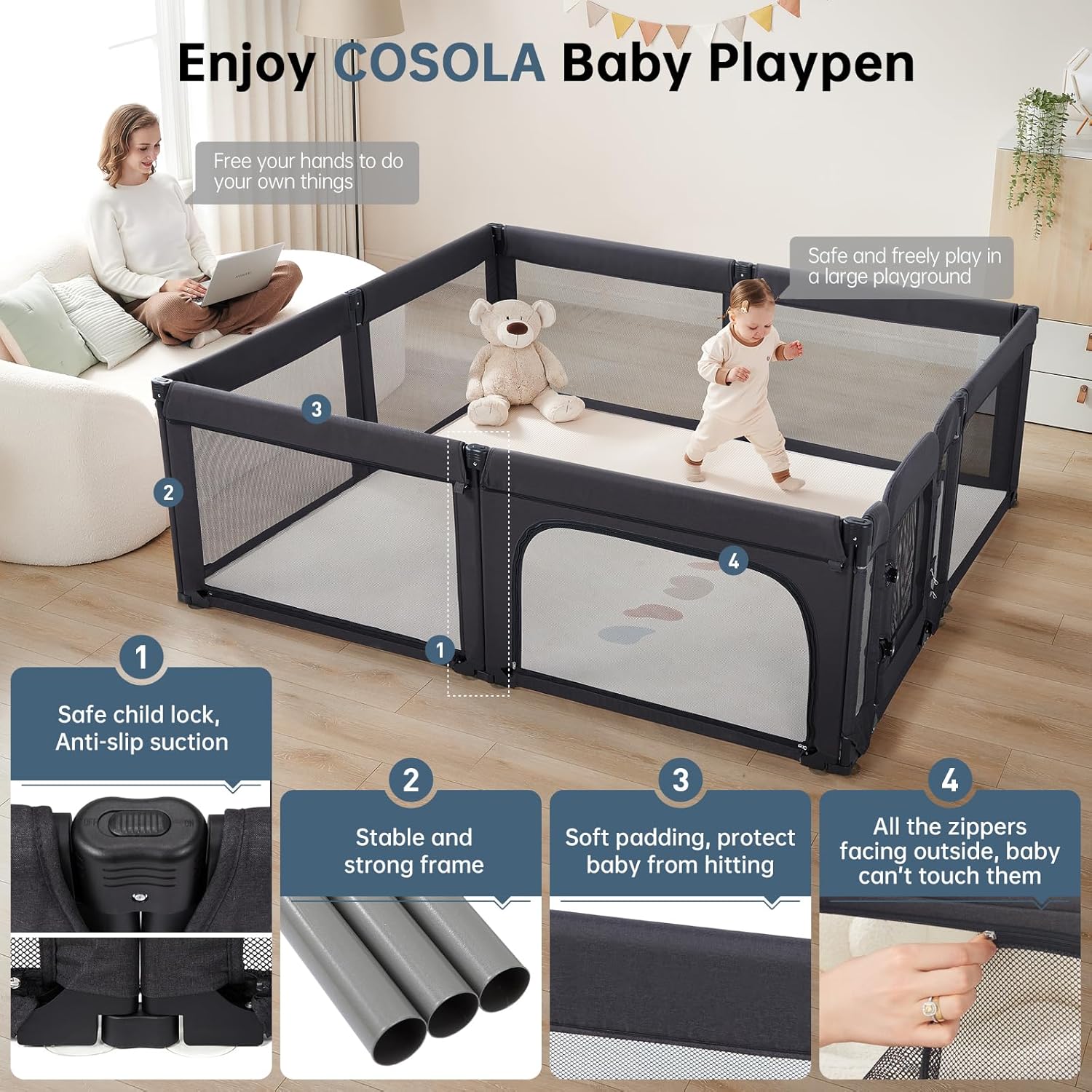 - [SAFETY FIEST]: Designed with safety in mind, our baby playpen features high-density sponge padding around the top and non-slip suction cups at the base, keeping your playpen securely in place and reducing the risk of bumps,your baby is safe in such a sturdy playpen.