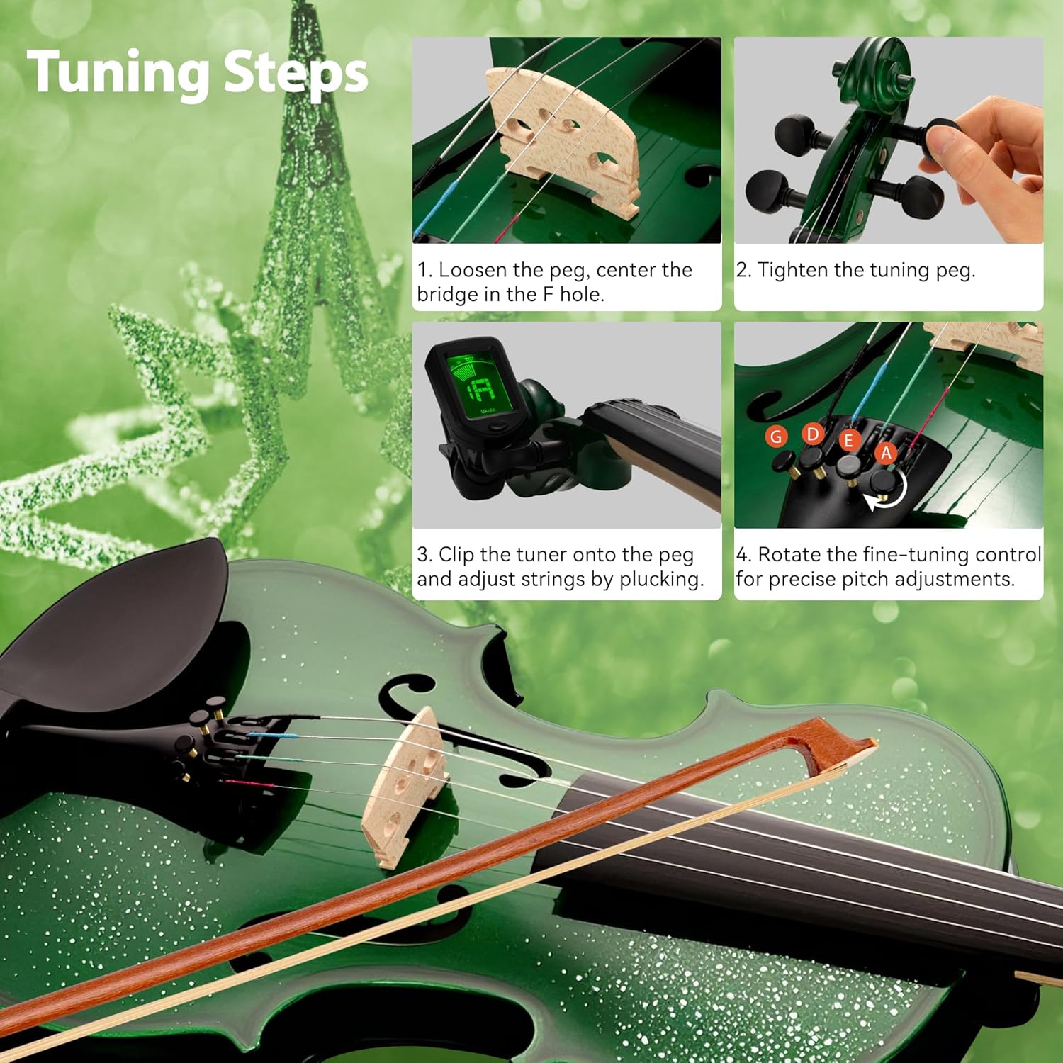 Poseidon Violin for Beginner, Full Size Violin Set for Kids Student with Hard Case, Extra 4/4 Strings Set, Violin Bow, Horse Bridges, Rosin, Shoulder Rest, Clip-on Tuner, Manual - Green Glossy