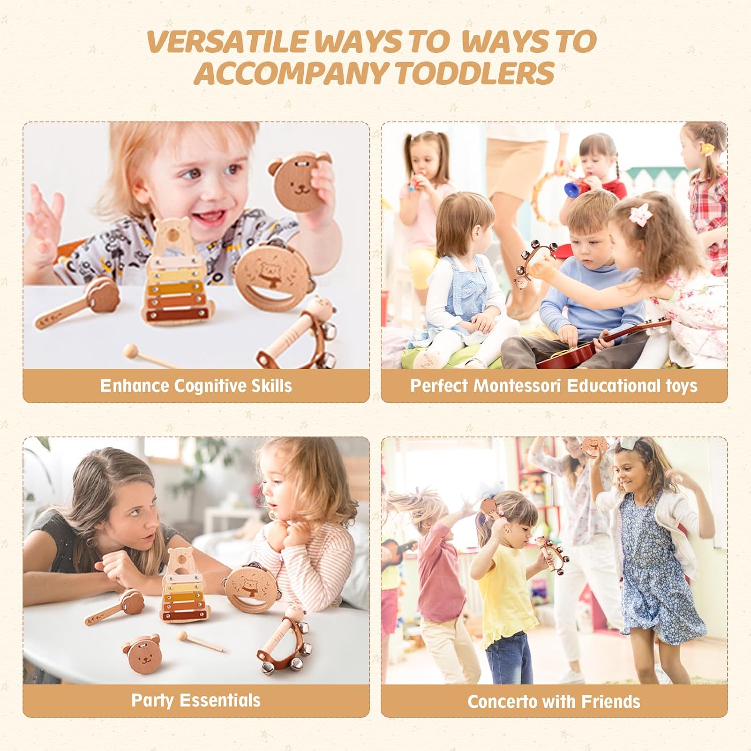 - EERKEOD MONTESSORI MUCICAL INSTRUMENTS:Crafted with adorable Wooden Design and care, our Percussion musical Instruments set features cute, bear-themed designs that delight little ones. Each instrument is made from high-quality natural wood, ensuring a safe and non-toxic playtime experience