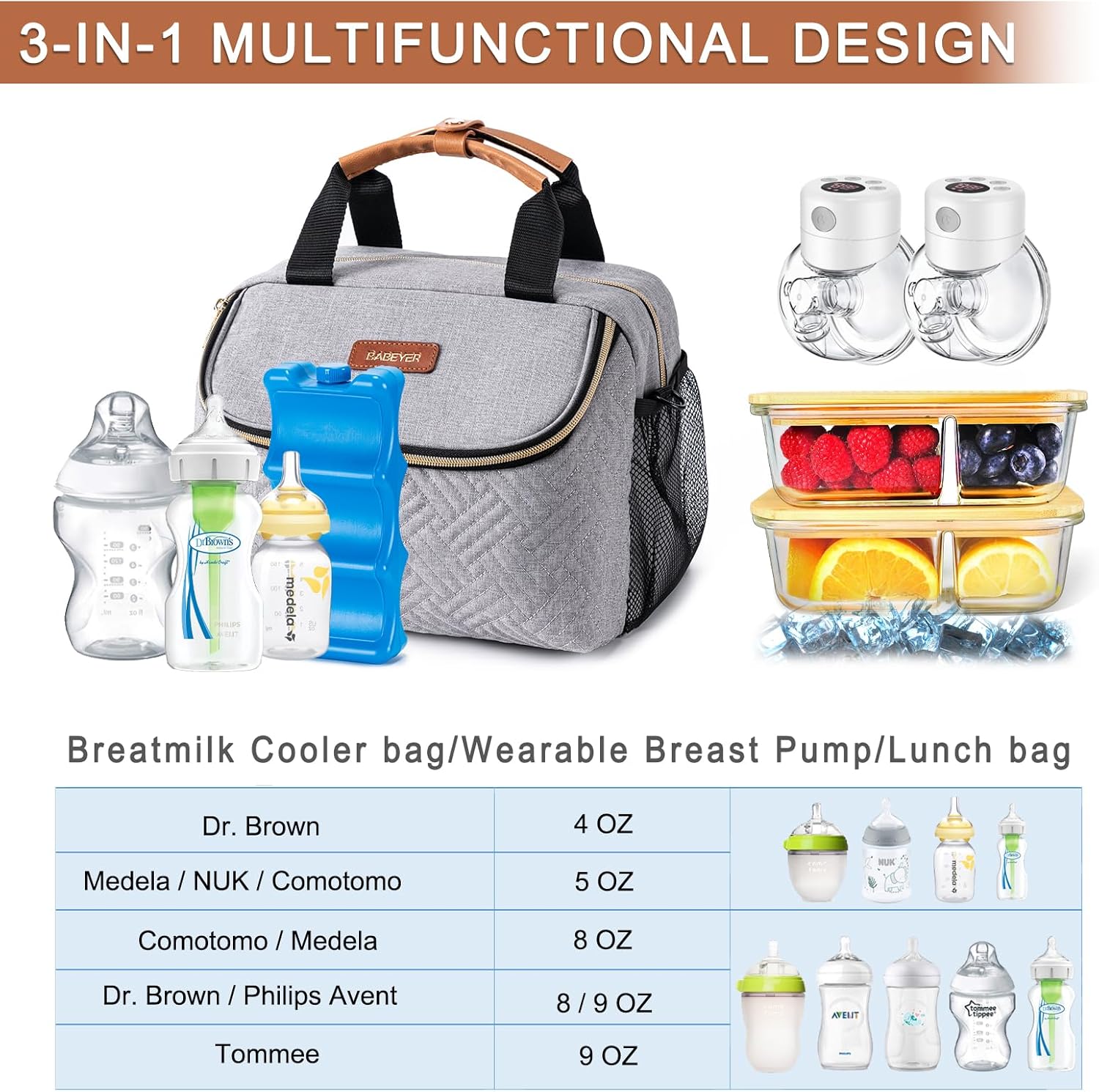 - Easy to Carry: BABEYER breastmilk cooler bag come with an adjustable shoulder strap which can be cross-body over the shoulder. Comfortable leather handle for easy put on the stroller. Come with a PEVA waterproof mat, it can be used to place baby bottles, breast pumps & accessories
