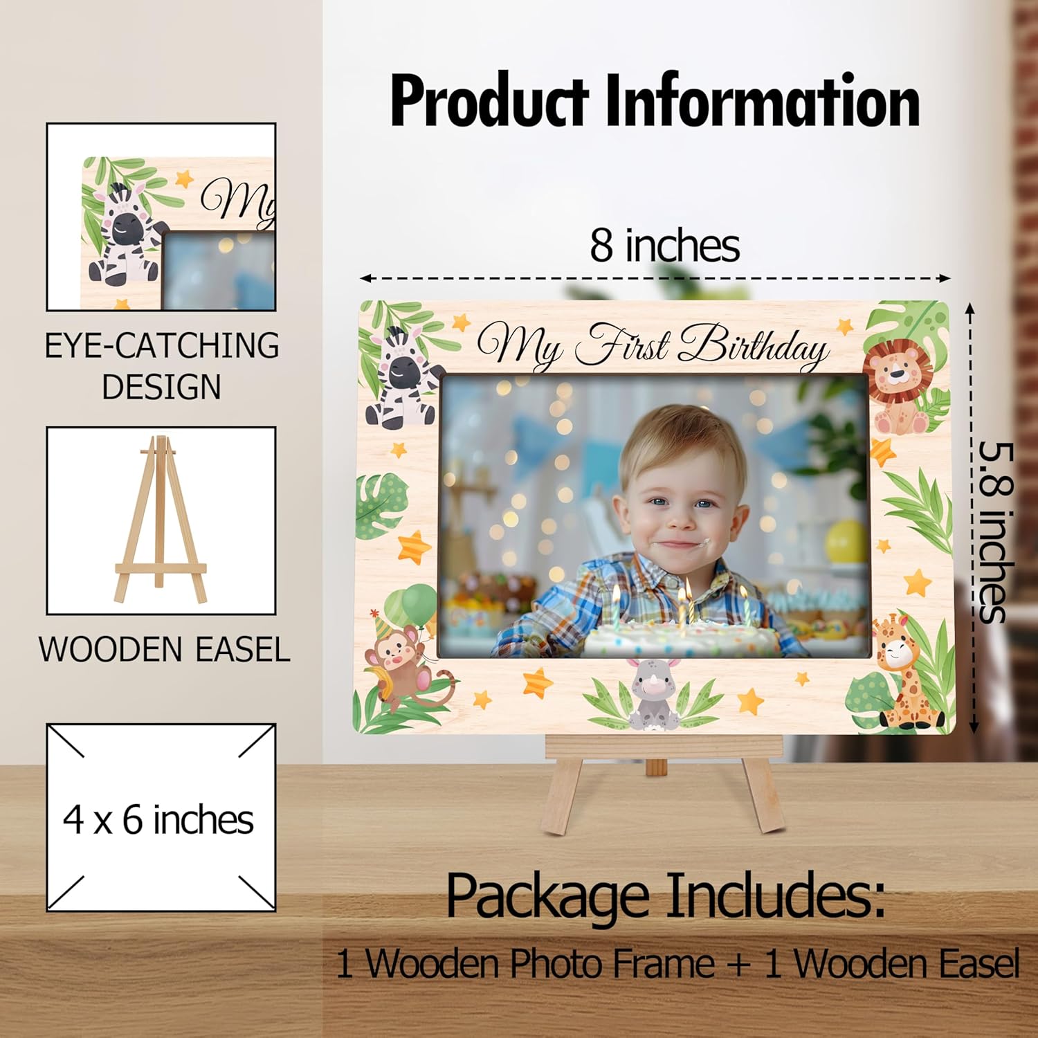 My 1st Birthday Picture Frames, Jungle Animal Wooden 4x6 Photo Frame with Easel, Baby First Year Birthday Gifts for Home Office Tabletop Display Decorations - G04
