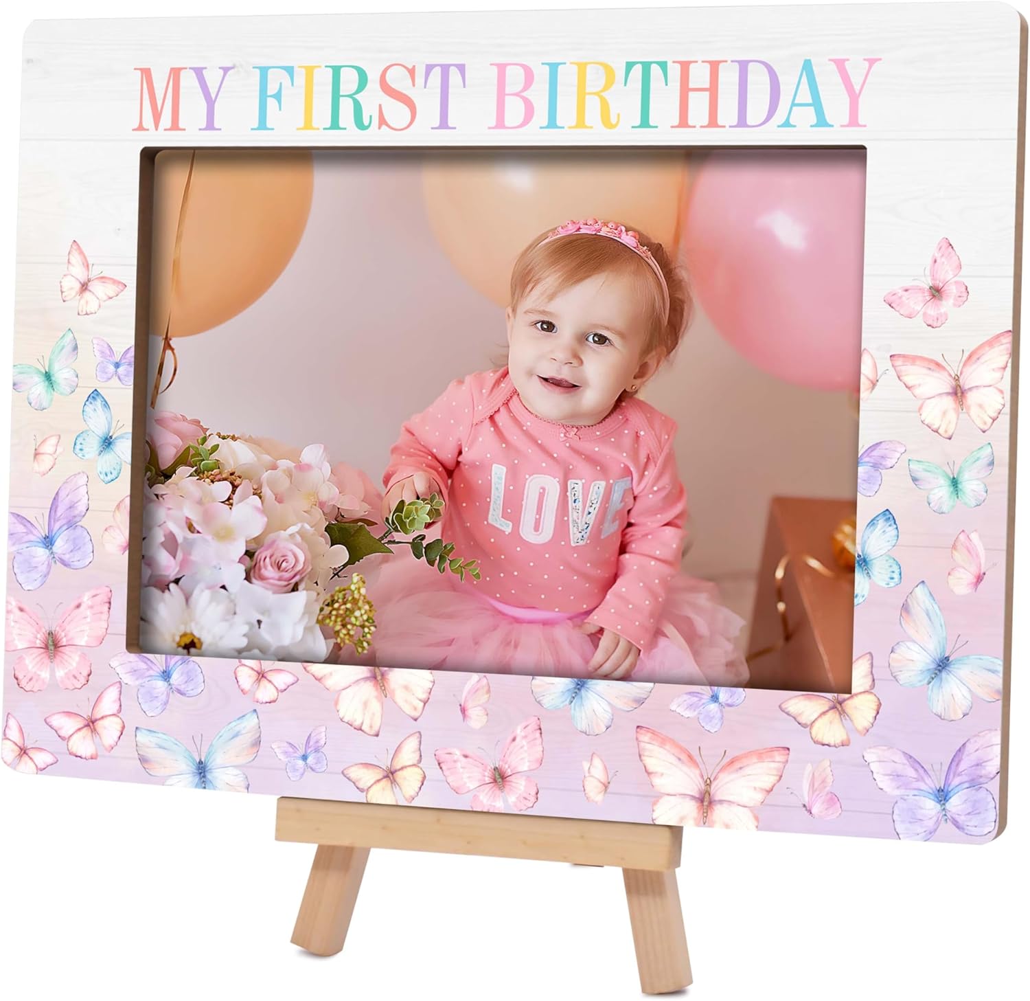 My 1st Birthday Picture Frames, Rainbow Butterfly Wooden 4x6 Photo Frame with Easel, Baby First Year Birthday Gifts for Home Office Tabletop Display Decorations - G06